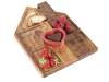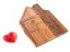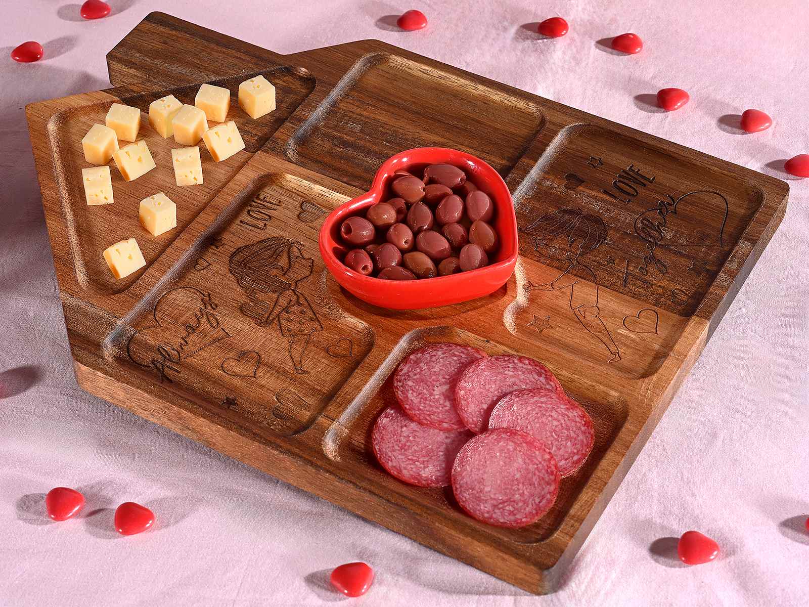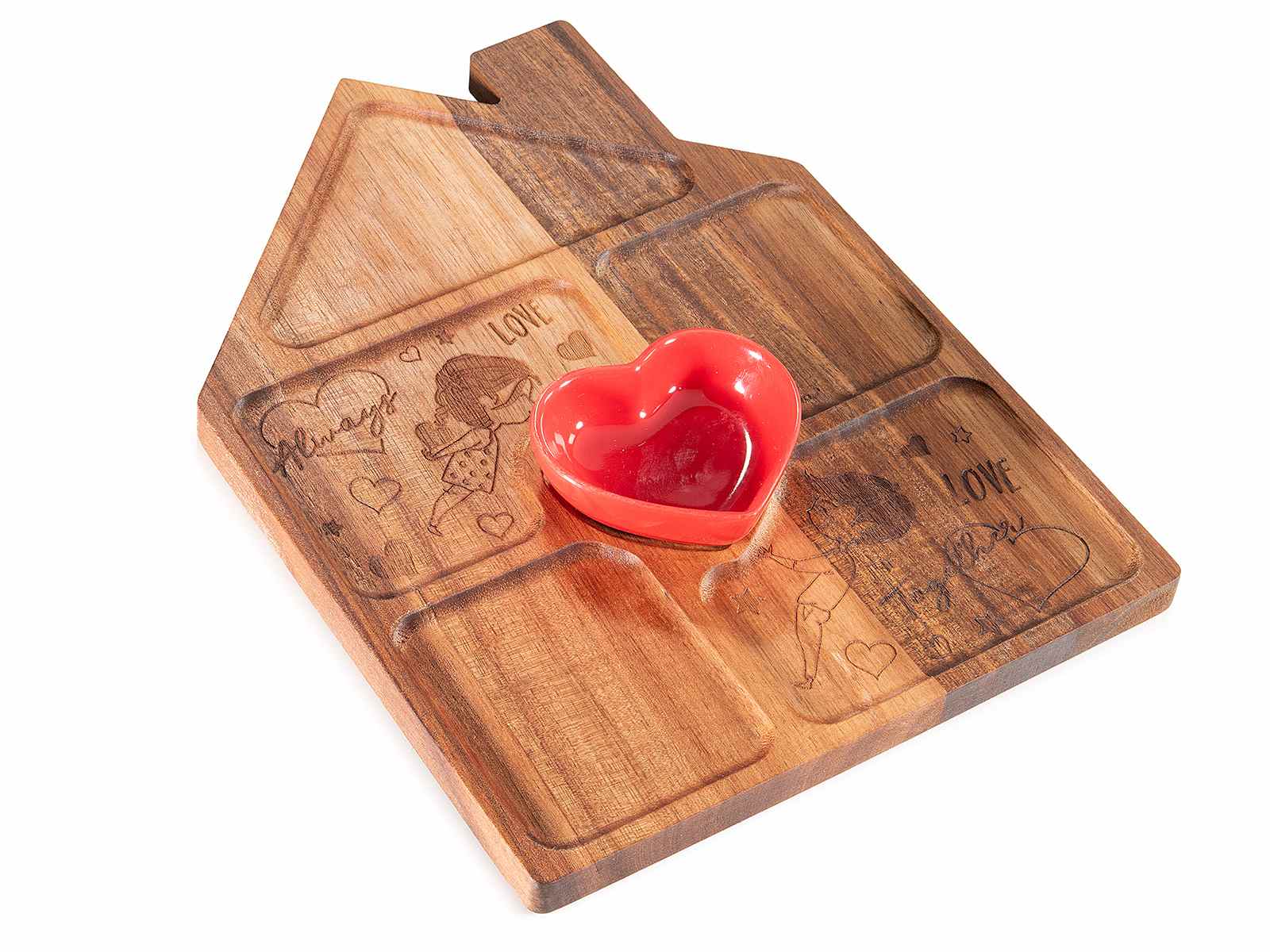 Plateau/planche à découper de la Saint-Valentin en bois d'acacia en forme de maison, avec 5 compartiments et un petit bol en céramique rouge en forme de cœur, décoré de motifs amoureux.