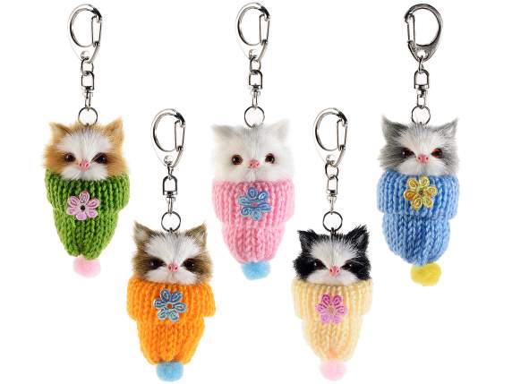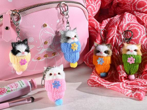 Porte-clés en fausse fourrure de chat dans un bonnet tricoté