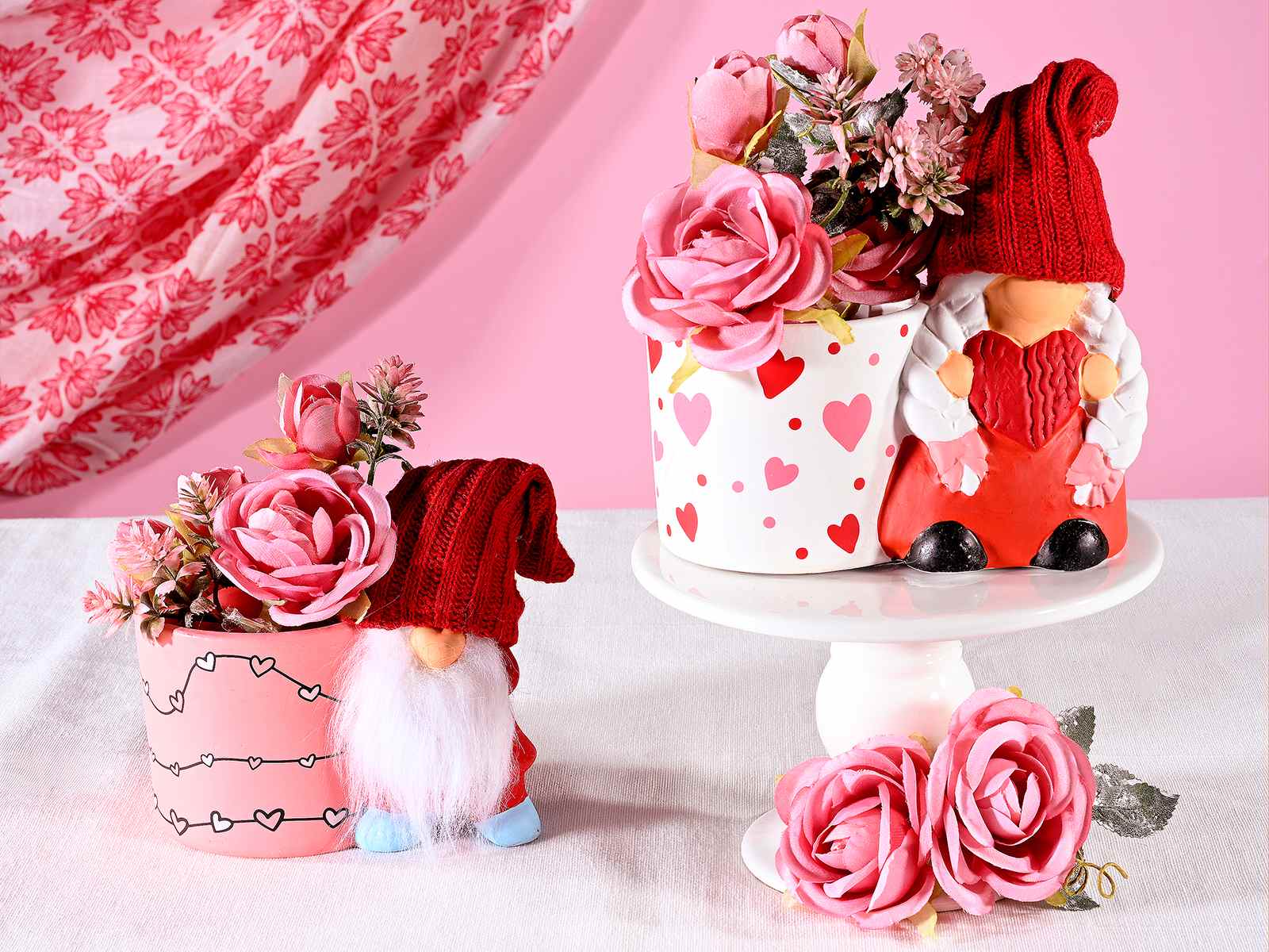Deux gnomes de la Saint-Valentin portant des bonnets tricotés et tenant un pot en céramique coloré décoré de petits cœurs.
