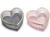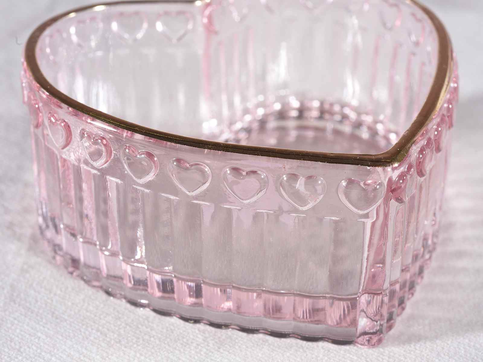 Récipients en verre gris et rose en forme de cœur avec bordure dorée, parfaits pour la Saint-Valentin
