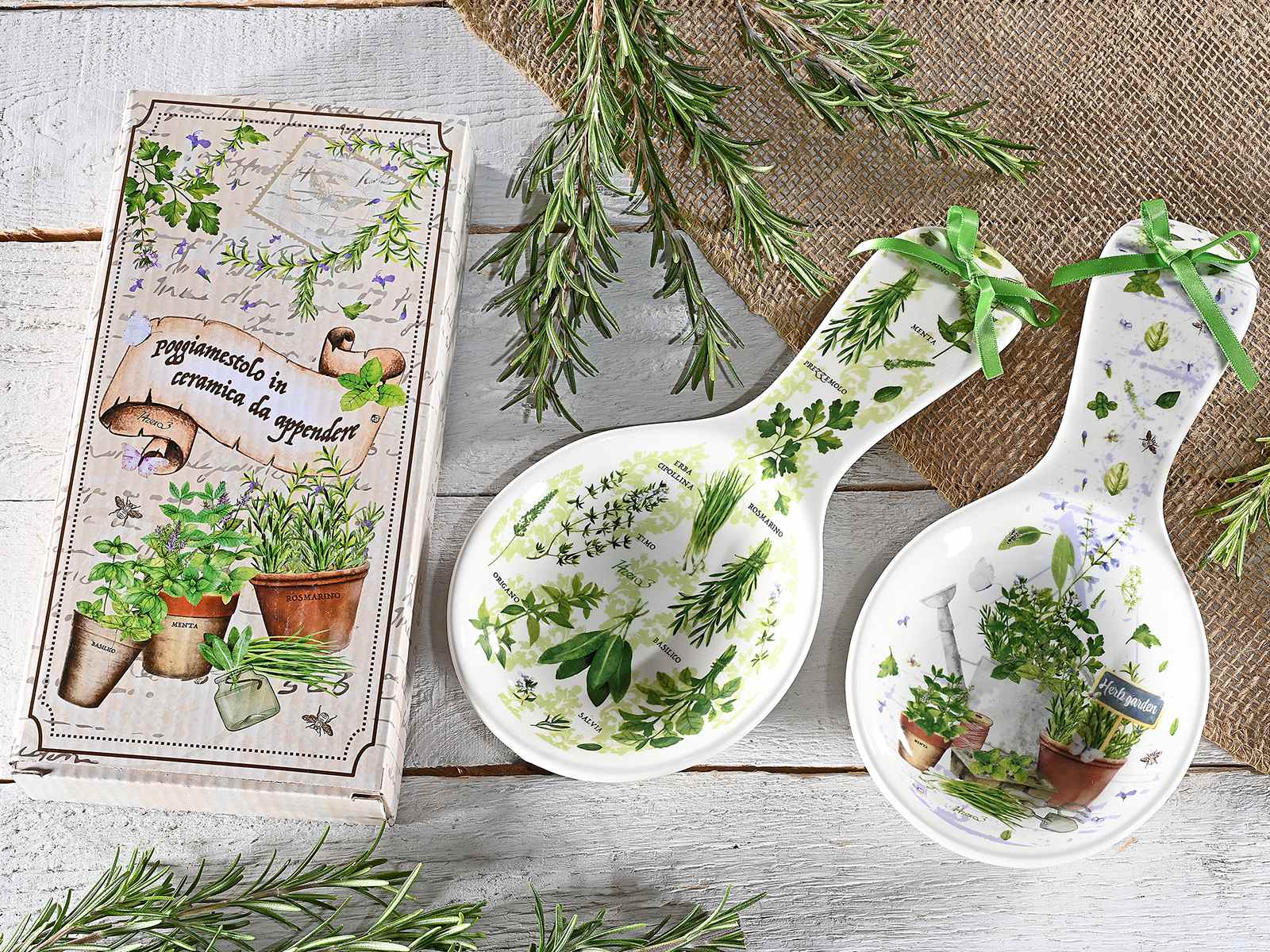 Repose-cuillère de cuisine en céramique avec nœud vert, présenté dans un coffret cadeau à motif d'herbes aromatiques.