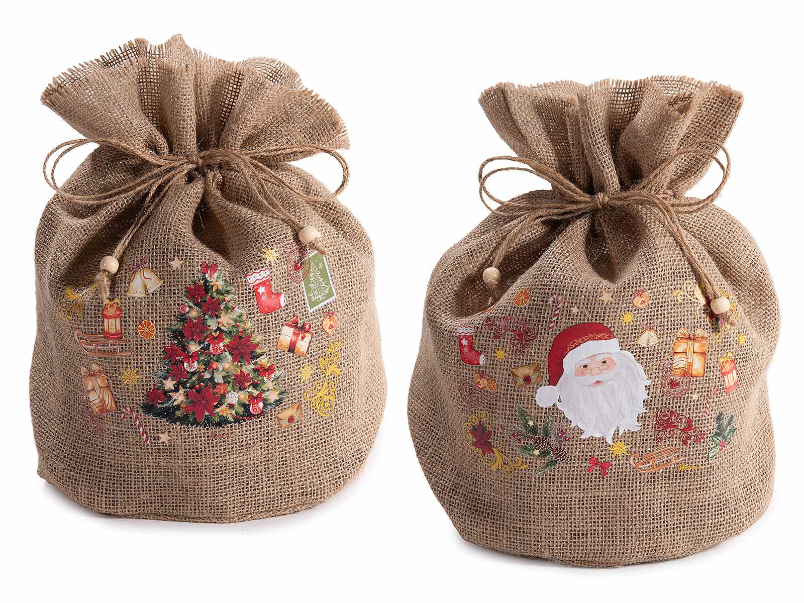 Sacs Panettone en toile effet jute avec cordon de serrage et décorations à imprimé de Noël