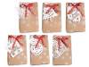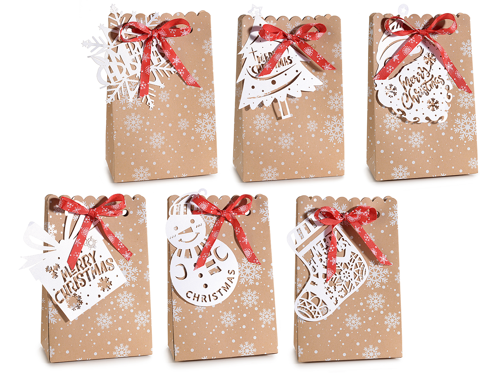 Sacs en papier naturel sans anses, décorés de flocons de neige, avec étiquette en papier perforé en forme de Noël et nœud décoratif rouge.