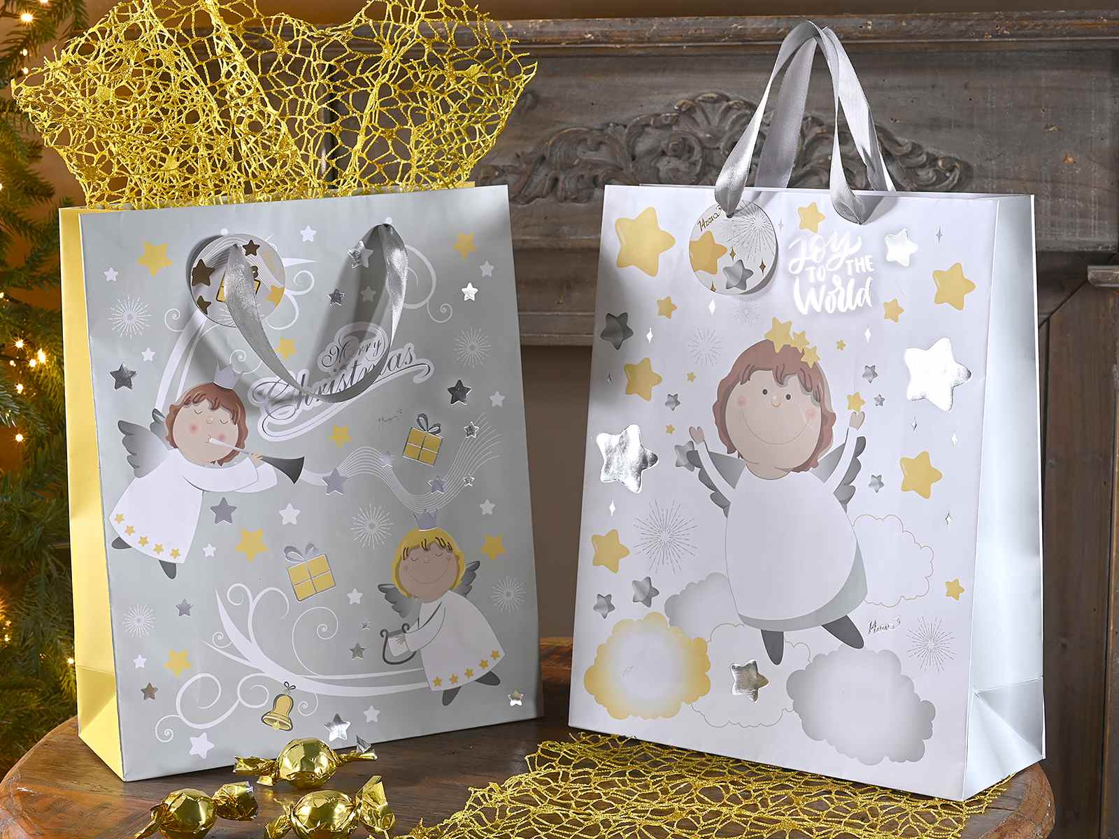 Sacs en papier/sacs de courses de Noël avec anges, détails dorés et poignées en satin