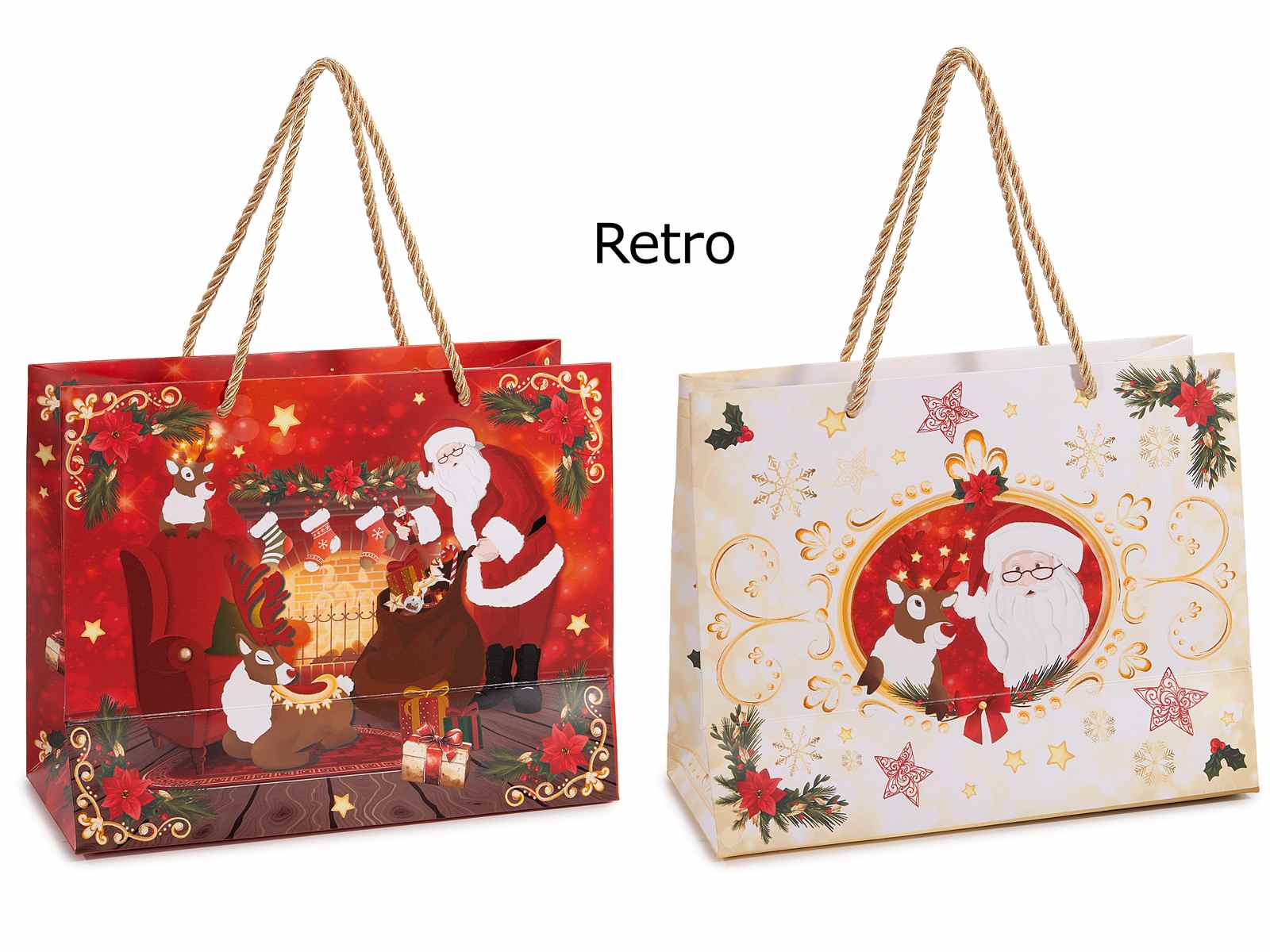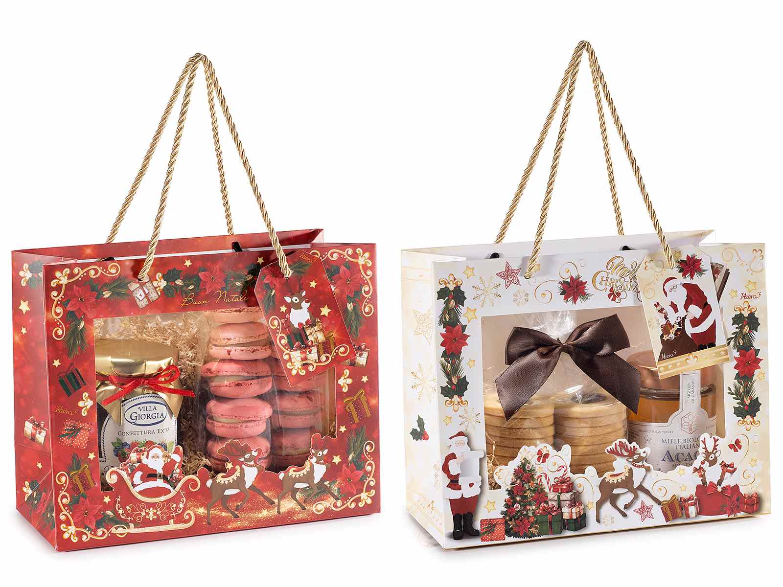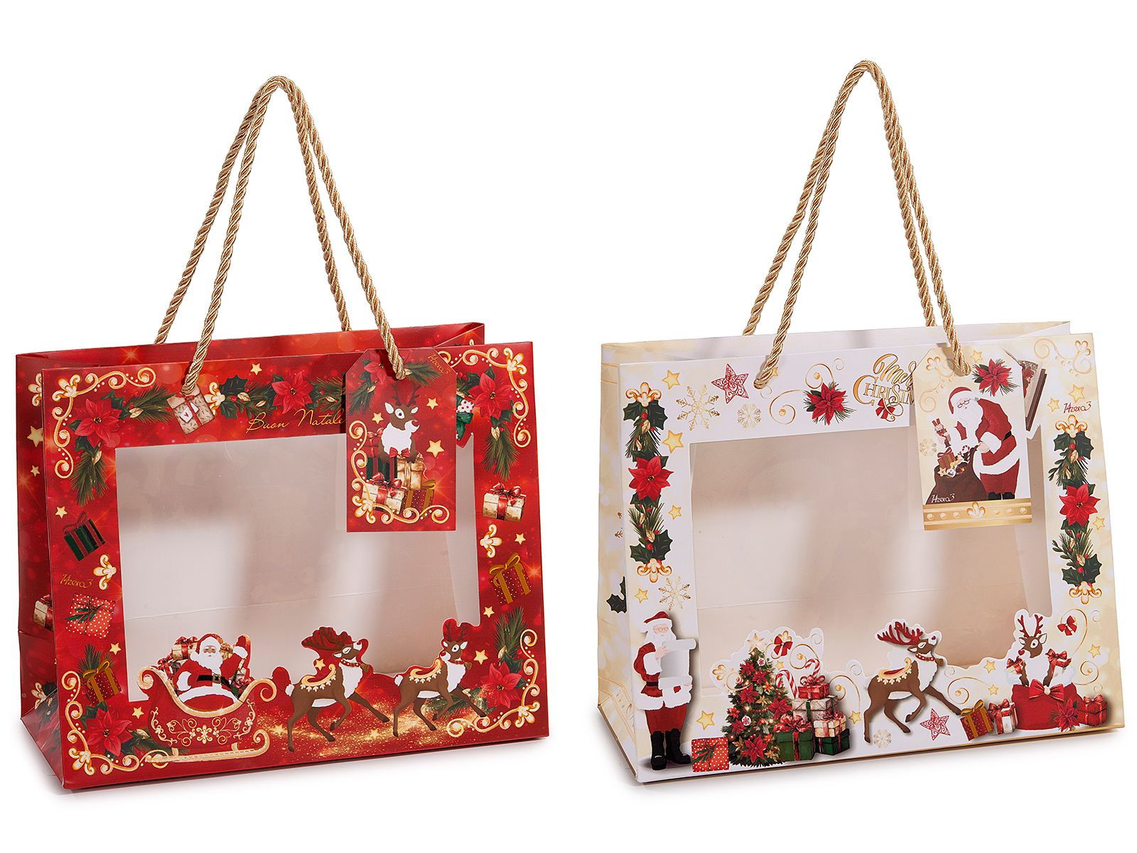 Sacs cadeaux/sacs de Noël/sacs à provisions avec fenêtre transparente, carte et poignées, en papier décoré du Père Noël et de rennes. Parfaits pour emballer des bonbons, du panettone et des cadeaux.