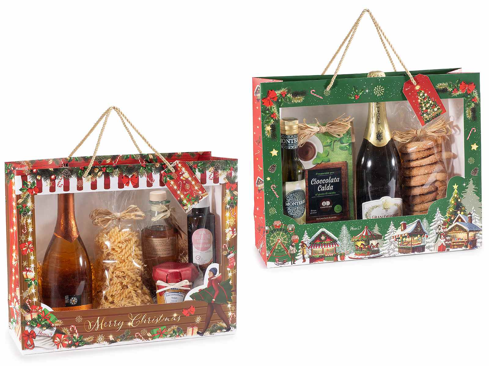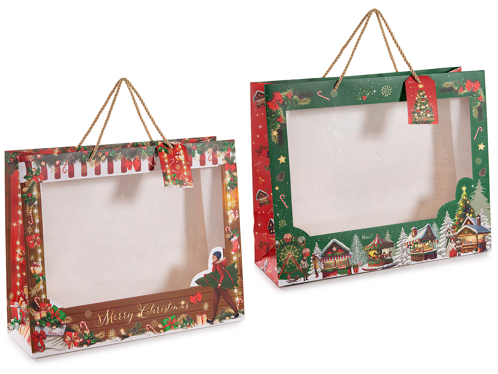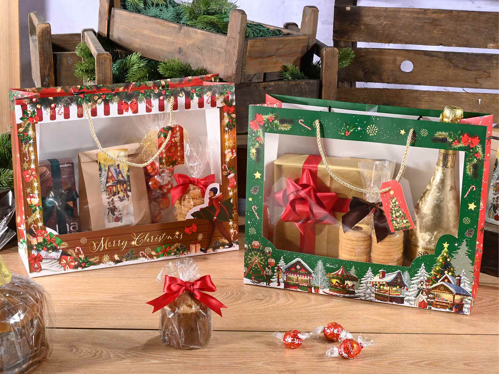 Sacs cadeaux de Noël en papier décoré de motifs festifs, avec fenêtre transparente et poignées. Parfaits pour emballer panettone, confiseries et cadeaux. Idéaux pour les boulangeries, les cavistes et les commerces.