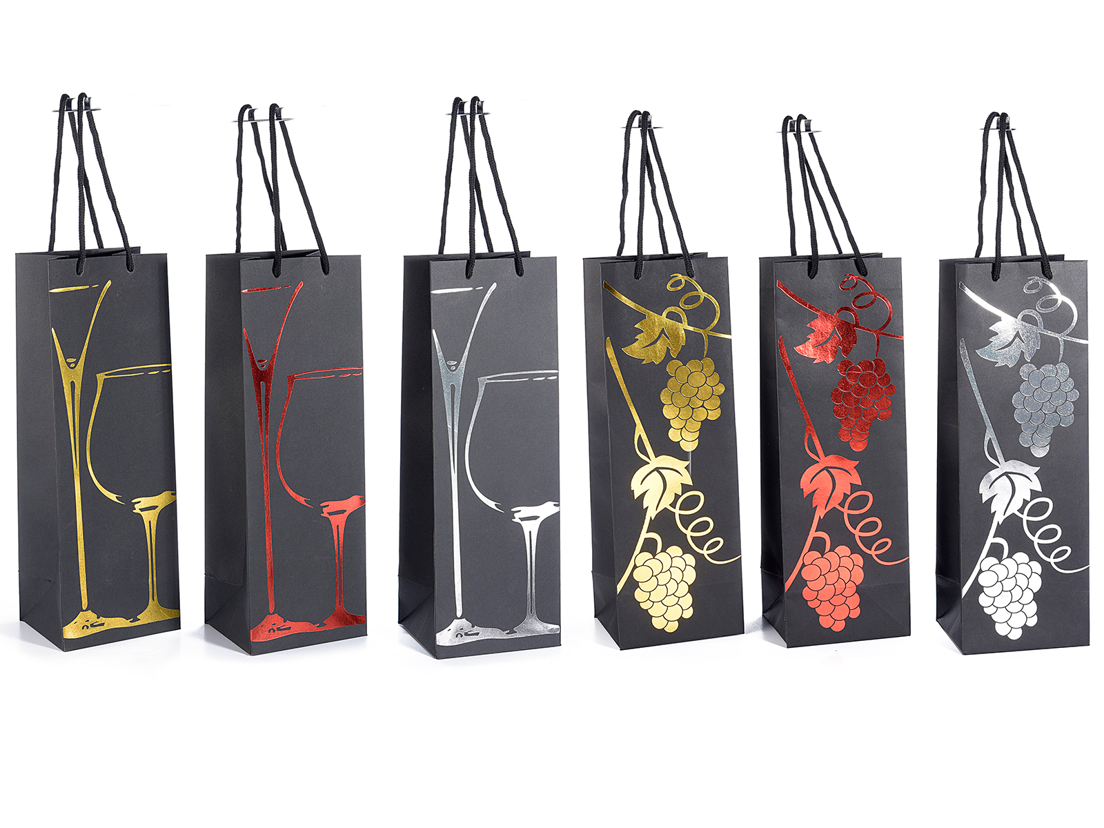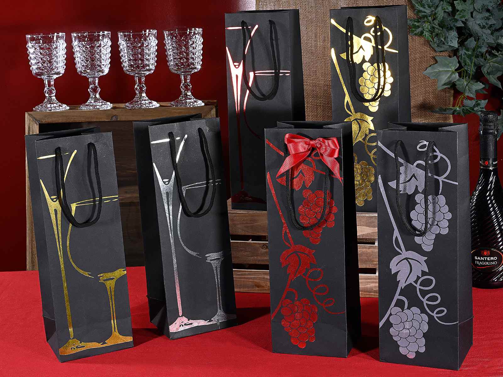 Sacs en papier rigide noir ornés de détails dorés, argentés et rouges, parfaits pour le vin et les spiritueux. Munis de poignées en corde, ils sont idéaux pour les cavistes, l'emballage cadeau et les conditionnements élégants.