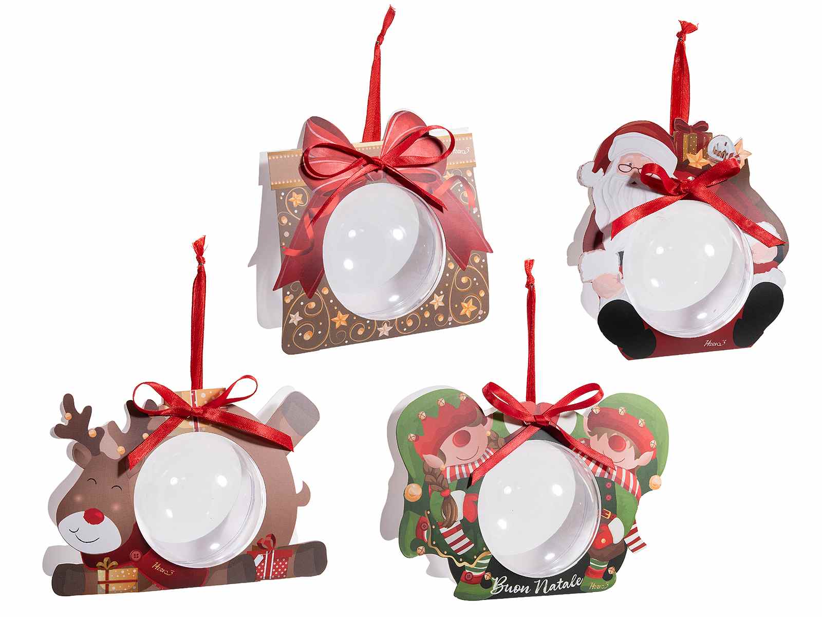 Boule de Noël transparente, de qualité alimentaire, avec une boîte cadeau en forme de personnage et un ruban pour l'accrocher au sapin. Idéale pour les petits cadeaux et les gourmandises de Noël.