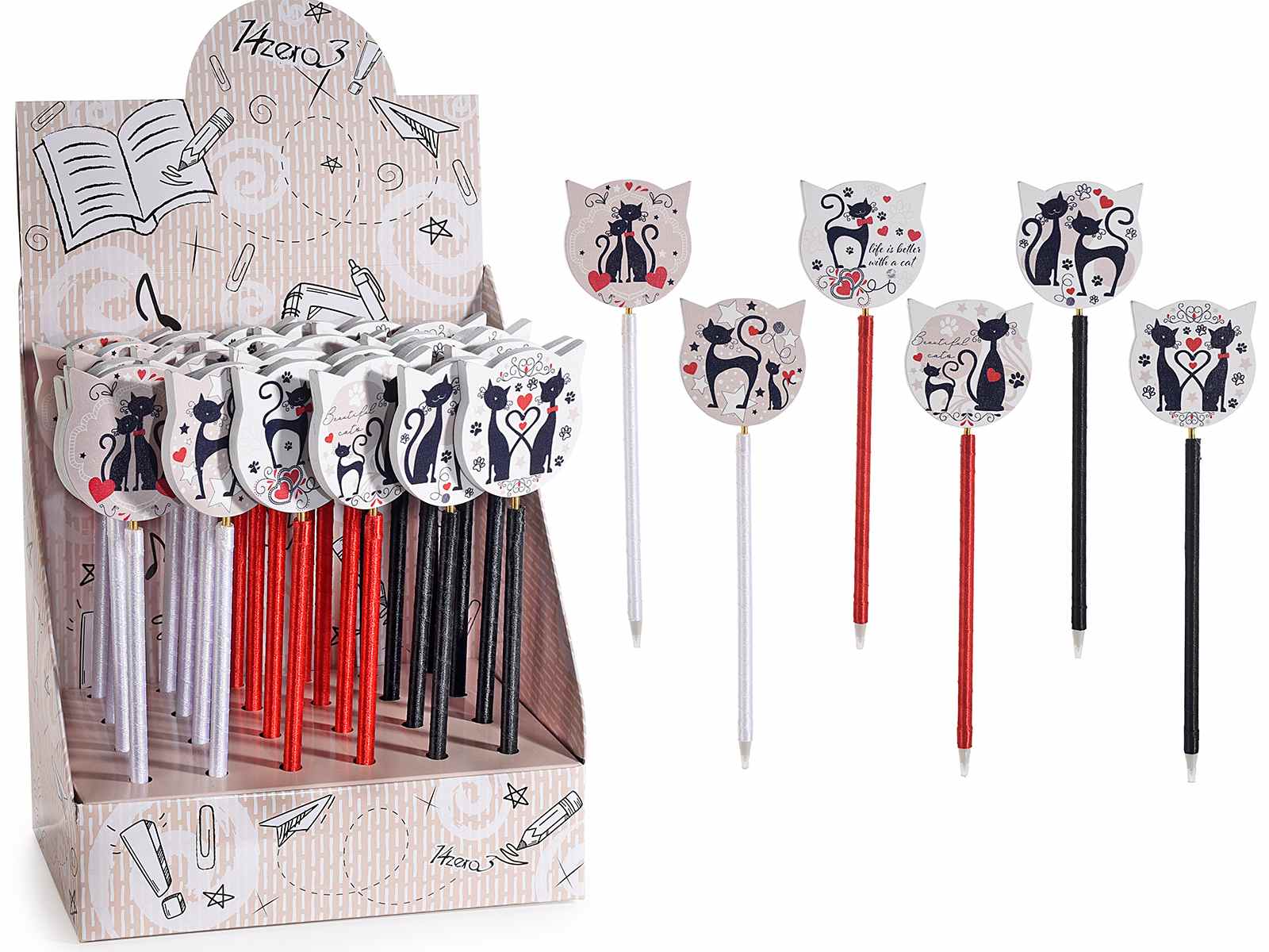 Stylos à bille à ressort en bois avec décoration de chat, présentoir de 24 pièces