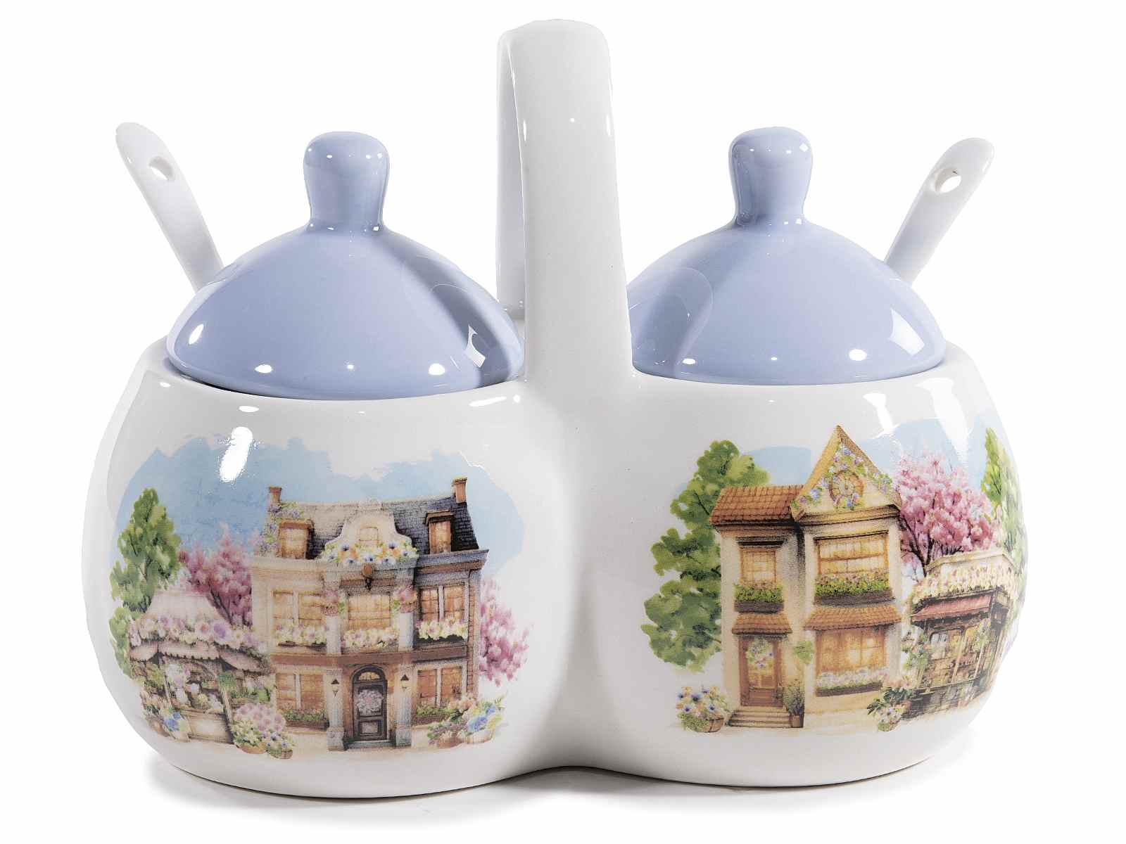 Sucrier double en céramique avec imprimé printanier, cuillères, couvercle et anse