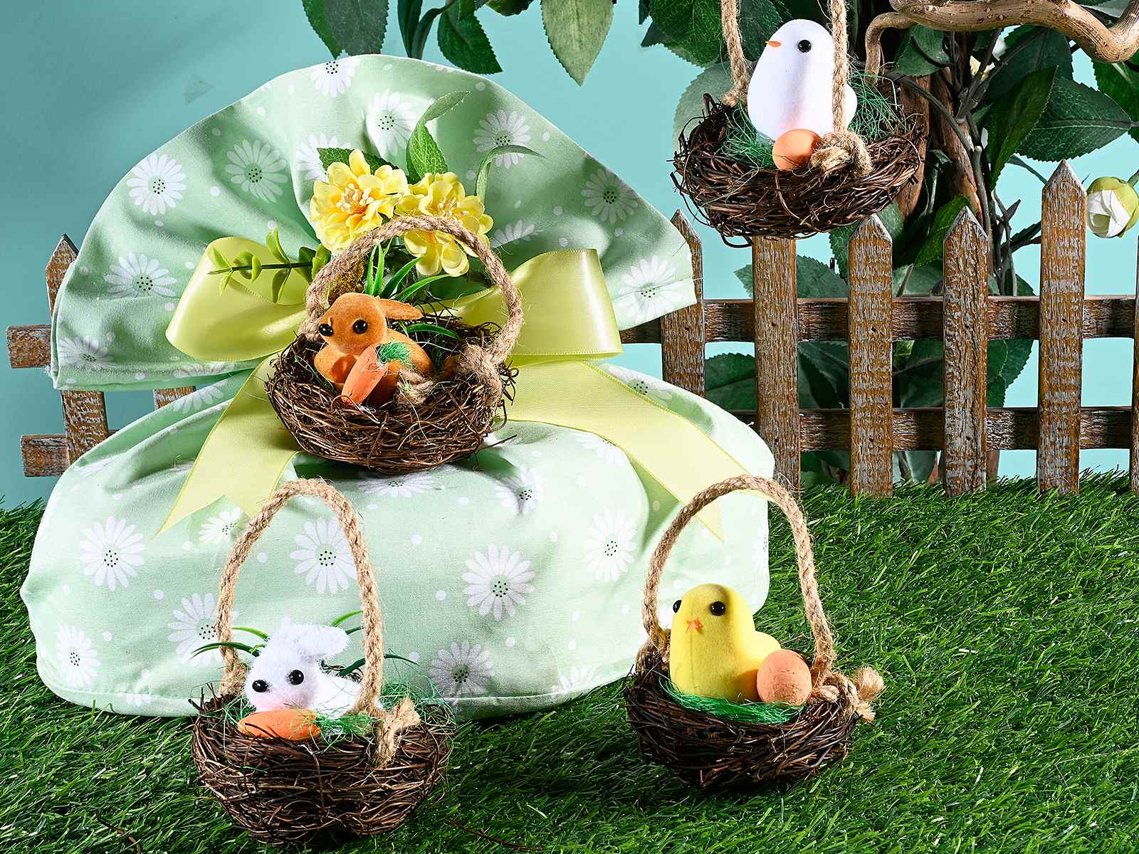 Lapin/poussin de Pâques floqué dans un nid en bois naturel avec poignée de suspension