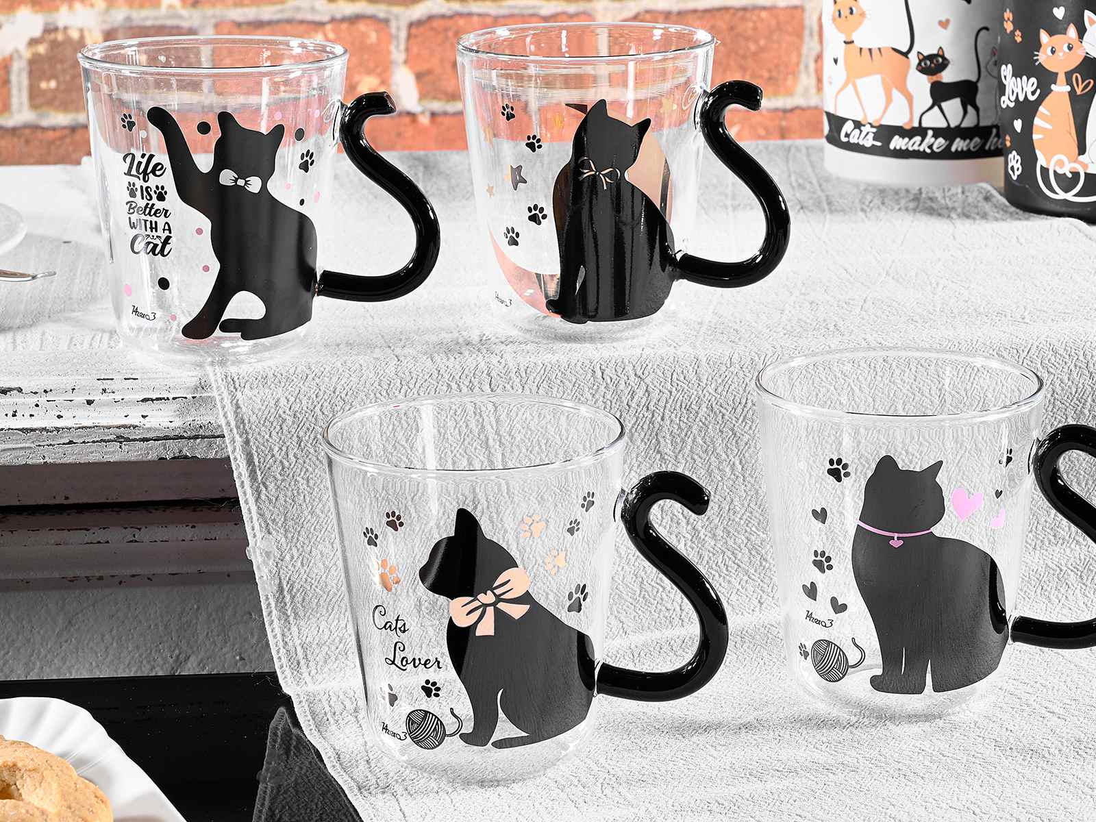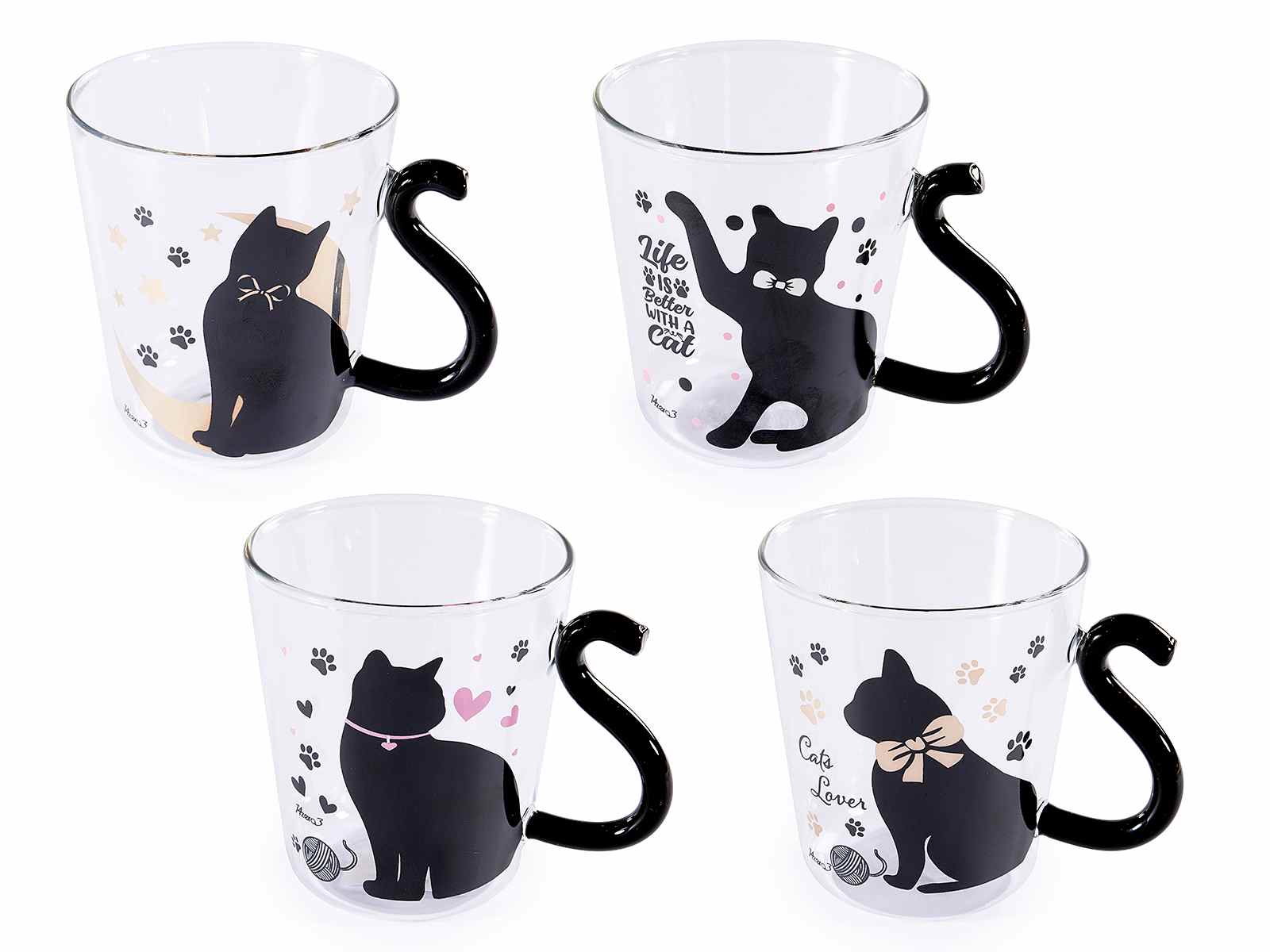 Gobelets en verre transparent avec anse en queue de chat et décorations à thème