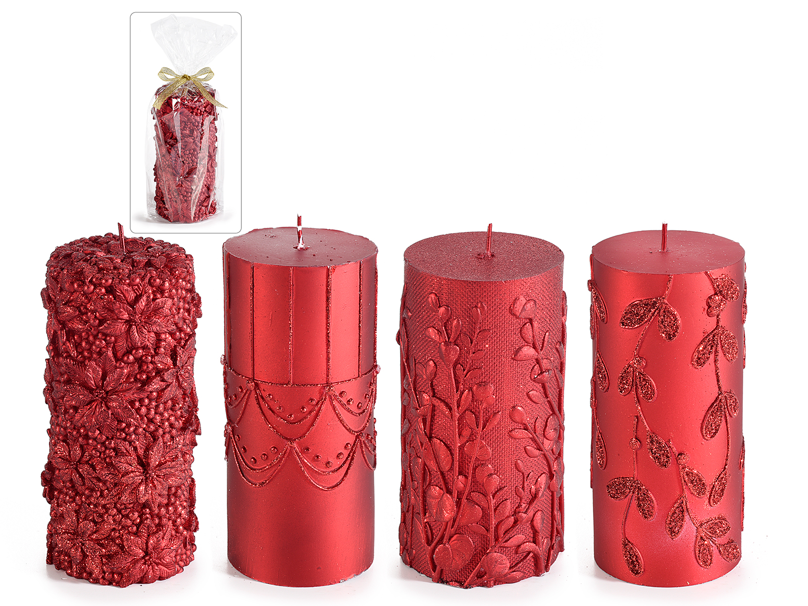 Grandes bougies rouges à décor en relief, vendues à l'unité.