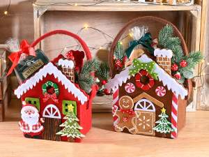 Sacs en tissu en forme de maison de Noël avec décorations de Noël en relief et détails en bois