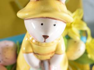 Paire de lapins en céramique colorés avec fleurs et œufs