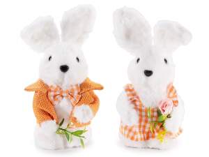 Paire de lapins de Pâques blancs en fausse fourrure avec des vêtements en tissu orange et des fleurs décoratives