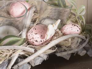 Centre de table bougeoir avec 3 bocaux en verre, décoré d'œufs artificiels en bois naturel
