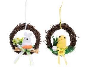 Couronnes de Pâques en bois avec nid d'oeufs, fleurs et noeud à suspendre