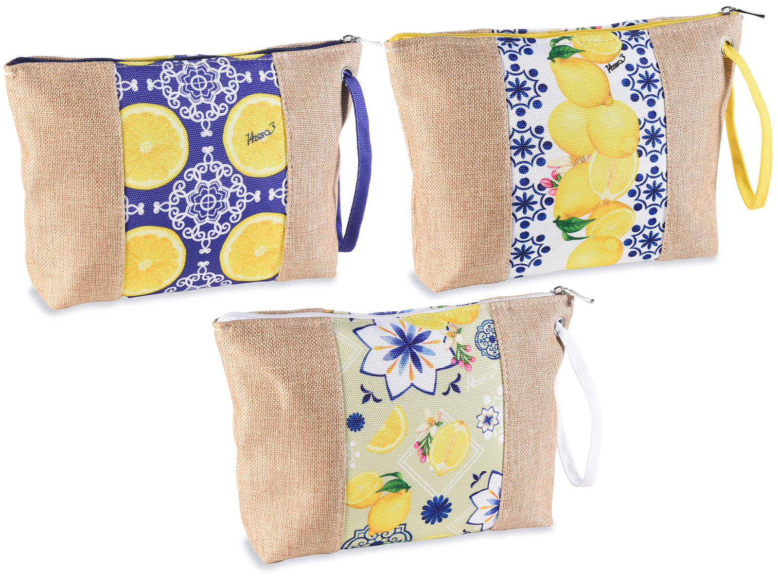 Trousse donna in tessuto e juta con zip, laccetto e decoro agrumi