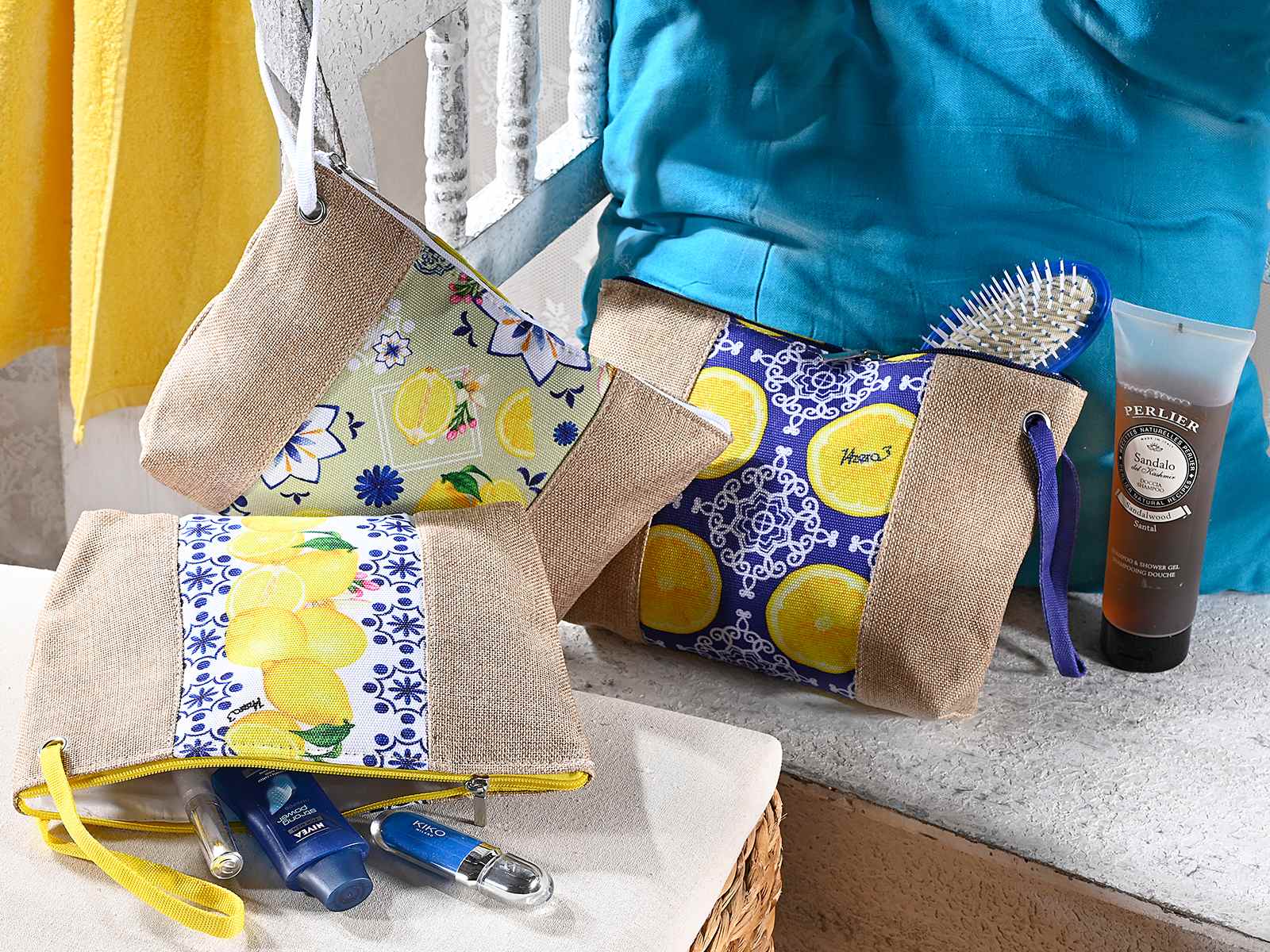 Trousse in tessuto e juta con zip, laccetto e decoro agrumi