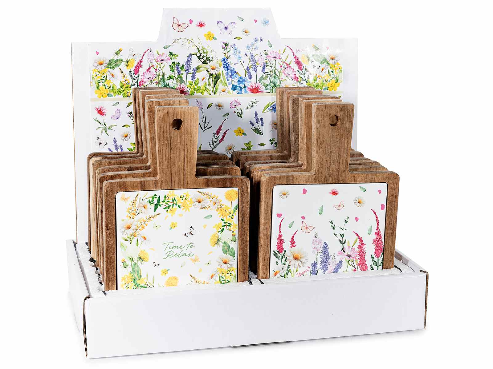 Taglieri / sottopentola adatti al contatto alimentare in legno e ceramica con decori floreali in espositore da 12 pezzi