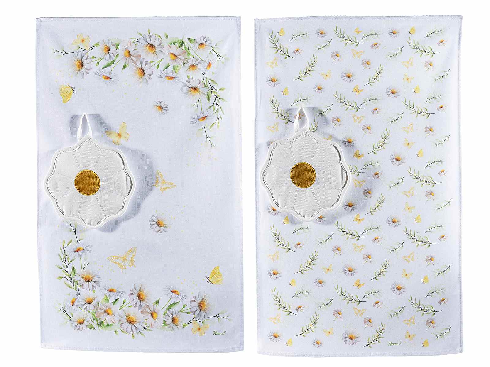 Set asciugapiatti da cucina in cotone con decori fiori e presina sagomata a fiore