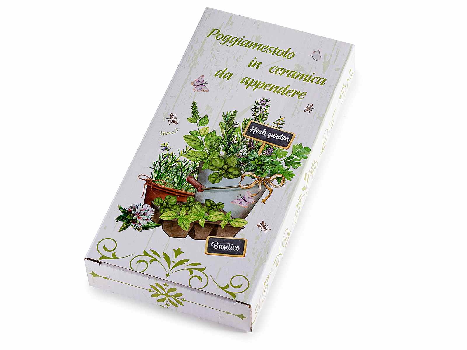 Poggiamestolo in ceramica decori erbe aromatiche e fiocco, in confezione regalo