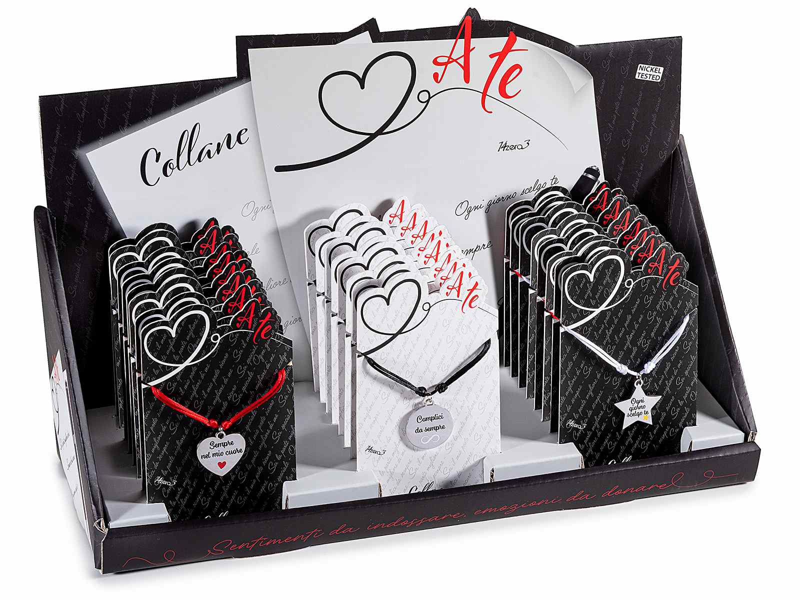 Collane in corda e charm in metallo inciso con frasi dedica e smaltato, in espositore da 24 pezzi