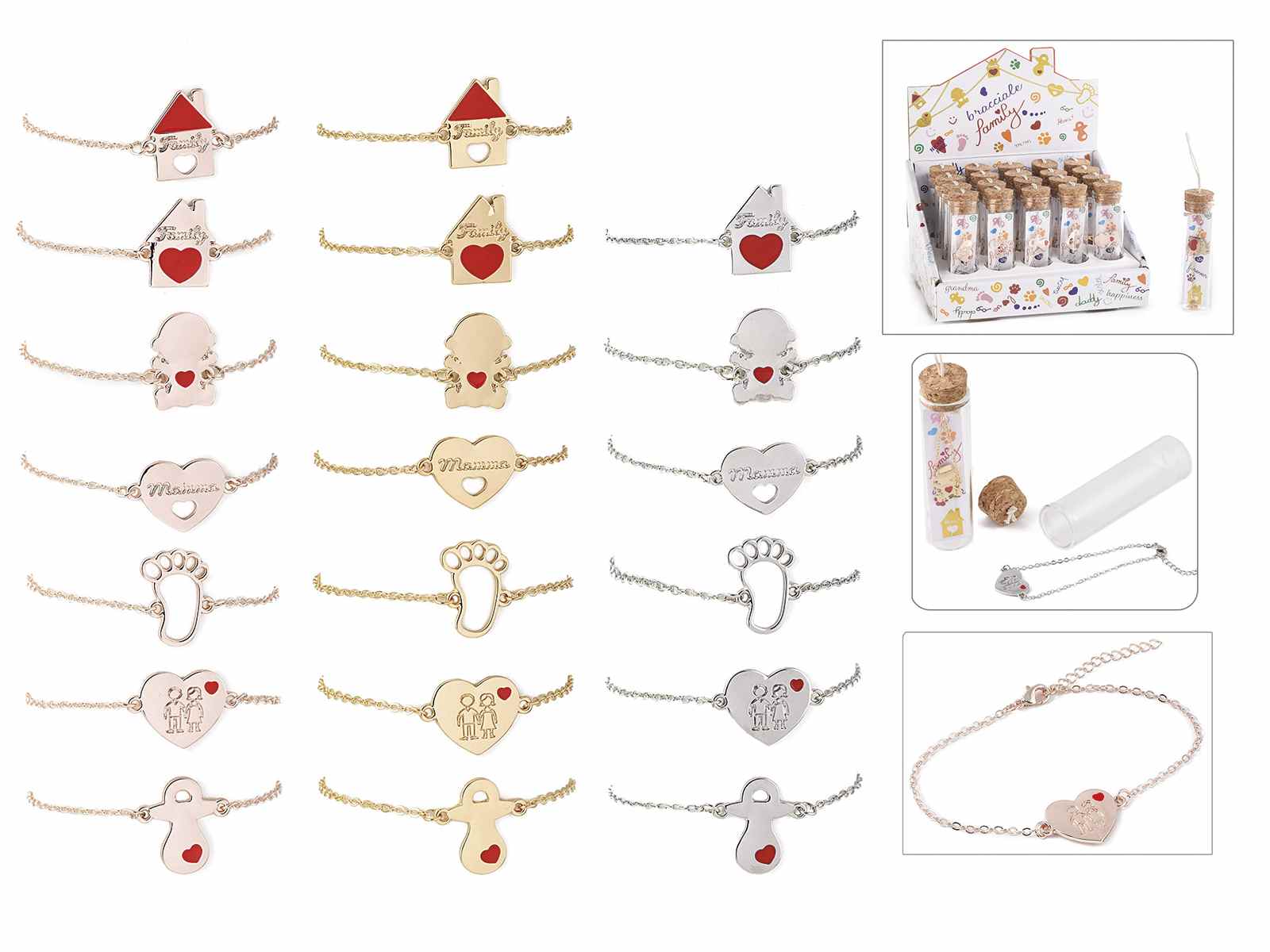 Bracciali in metallo con ciondolo nascita / famiglia in provetta di vetro ed espositore