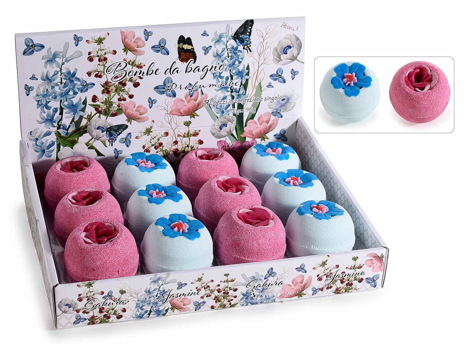 Bombe da bagno profumata e colorata con fiorellini in espositore da 12 pezzi