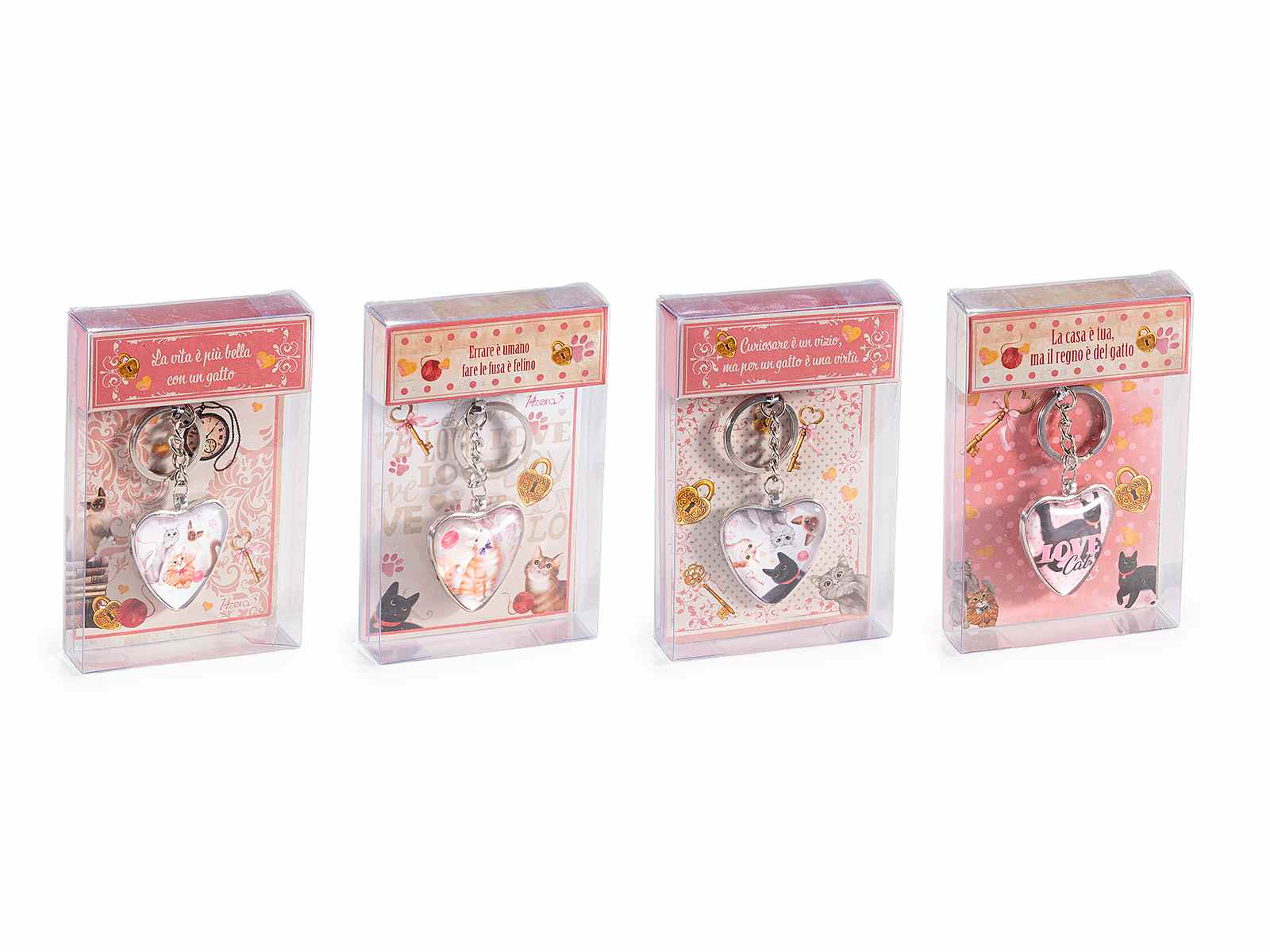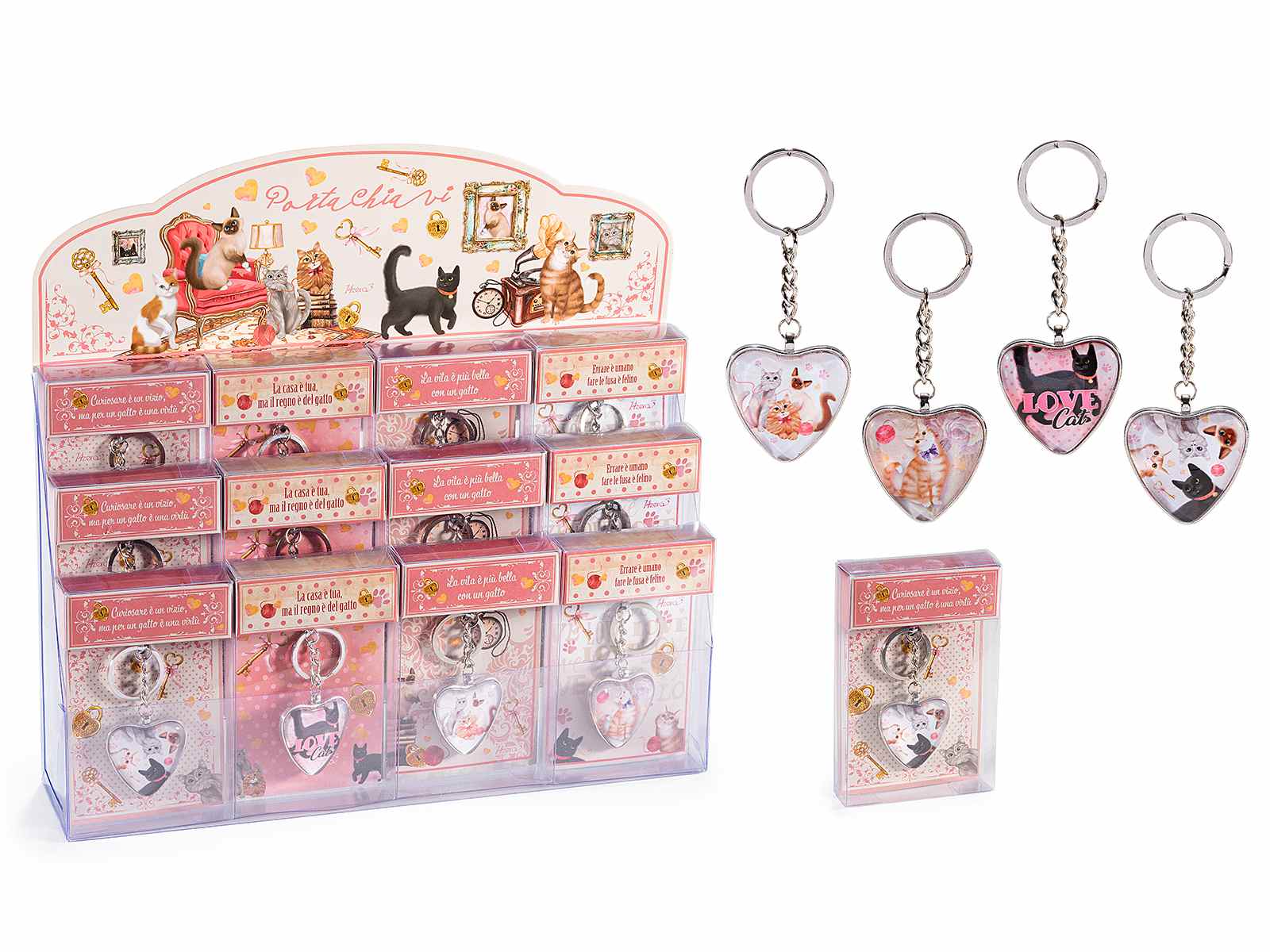 Charm a portachiavi in metallo e resina a forma di cuore con decori gattini in espositore da 12 pezzi