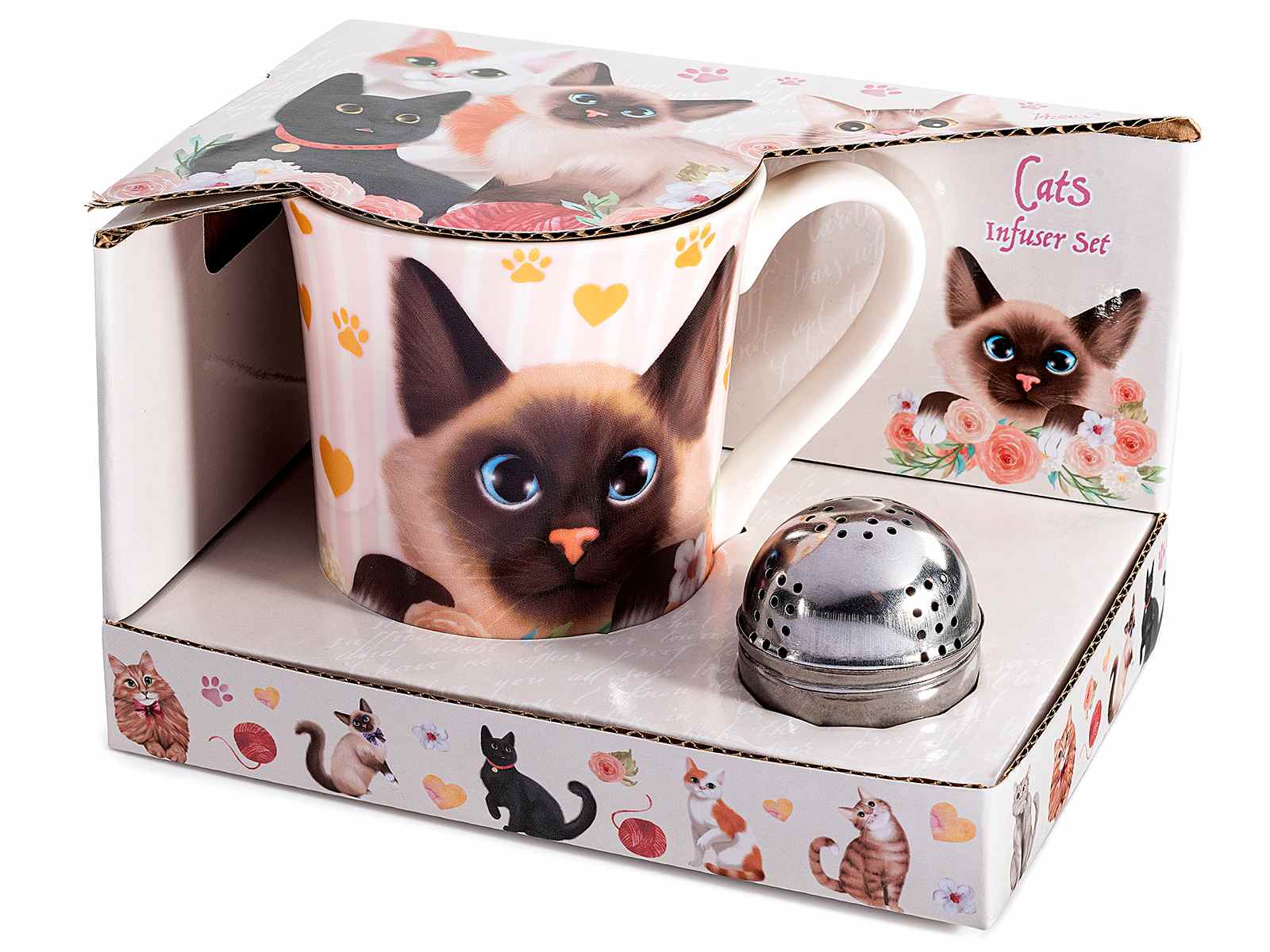 Tazze in porcellana con decori gatti e filtro in metallo in confezione regalo