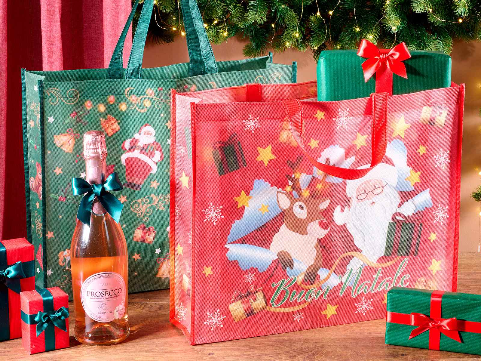 Borse di Natale riutilizzabili / shopper in tessuto non tessuto con stampa natalizia colorata e scritta Buon Natale