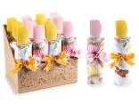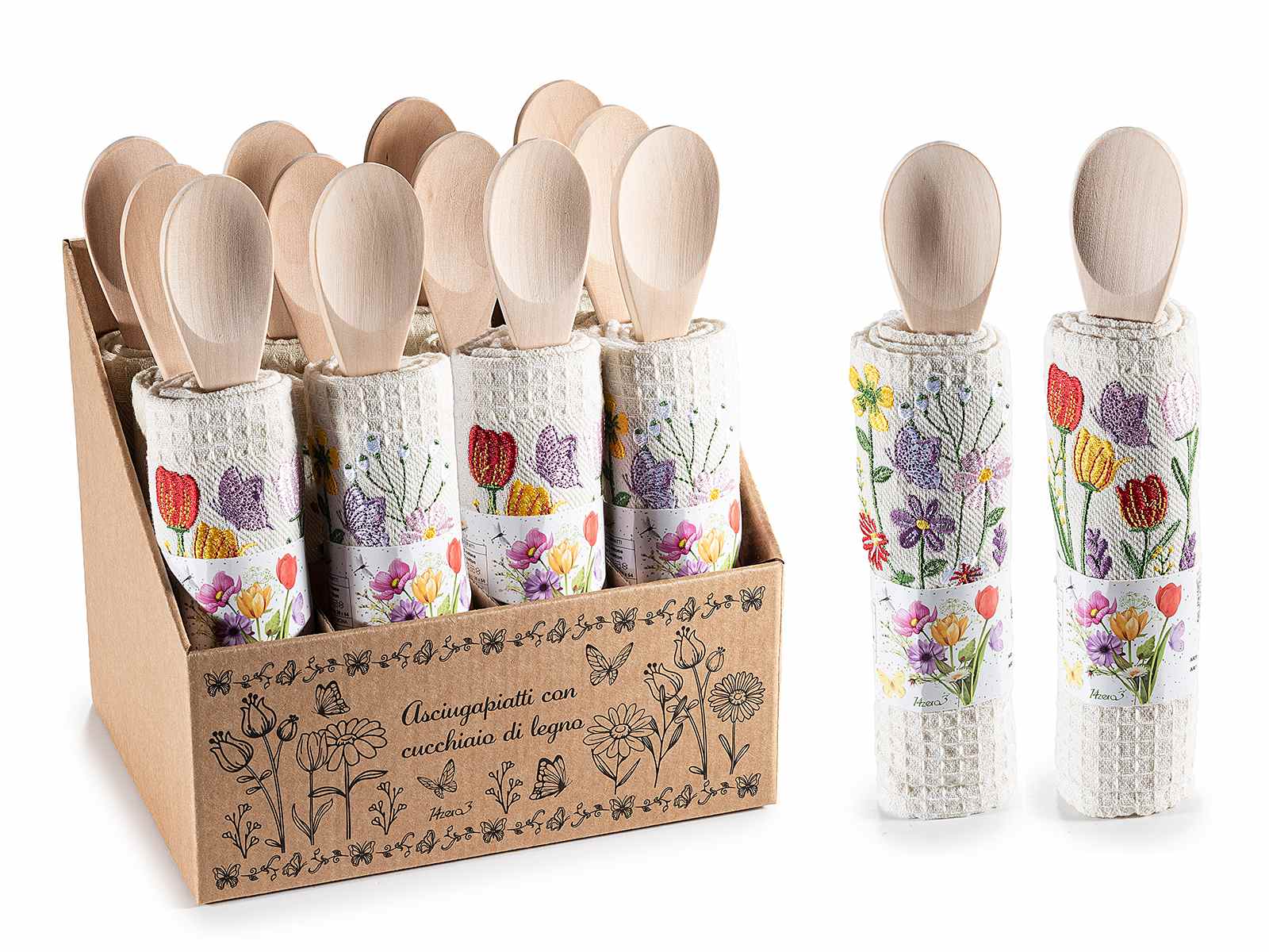 Asciugapiatti in cotone ricamato con motivi floreali e cucchiaio in legno in espositore da 12 pezzi