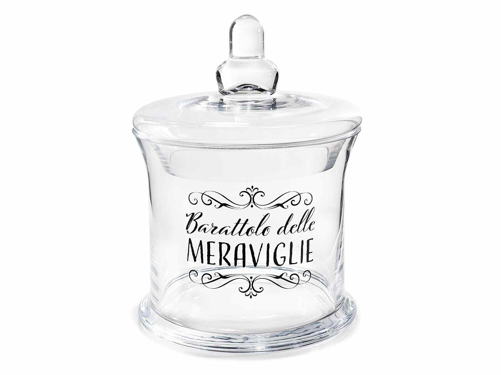 Barattoli alimentari a contenitore in vetro trasparente con coperchio e scritta Barattolo delle Meraviglie, ideale per conservare dolci, biscotti o caramelle.