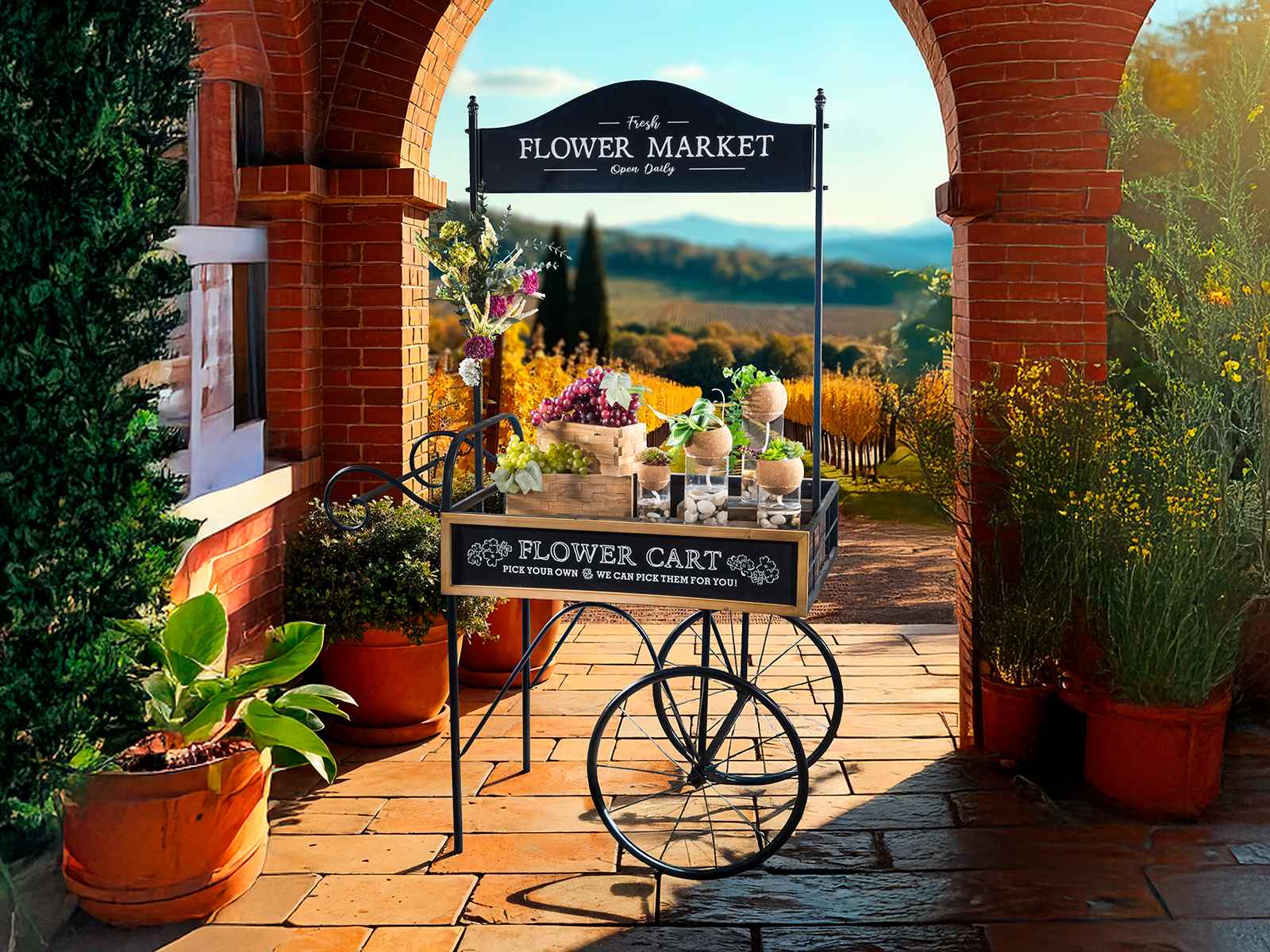 Carretti espositivi in metallo nero con insegna Flower Market e ruote decorative. Eleganti e raffinati, ideali per allestimenti floreali, negozi ed eventi. Un tocco vintage per esposizioni d'effetto.