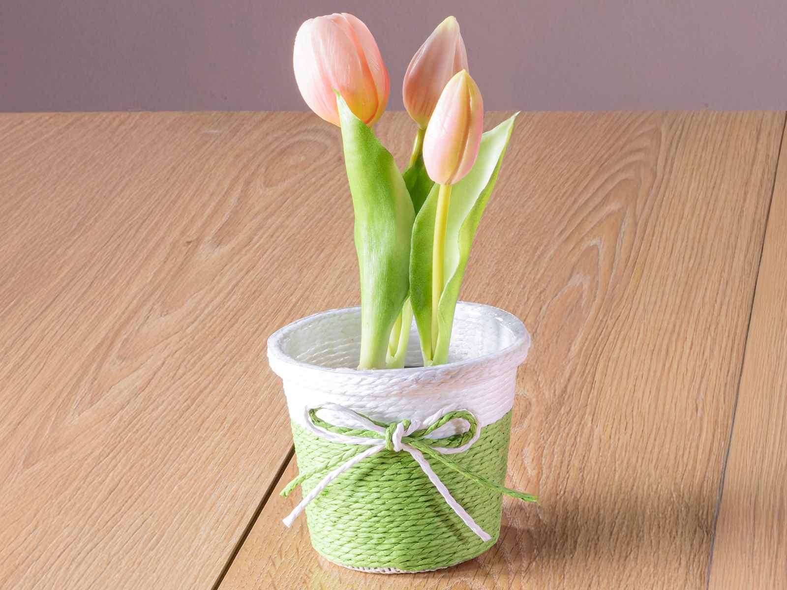 Cestino / Vasetto in carta intrecciata bicolore con fiocco