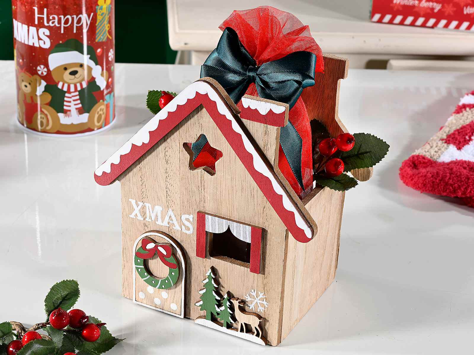Cestini natalizi in legno a forma di casetta con decori in rilievo