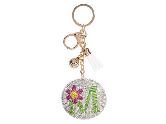 Charm / portachiavi lettera alfabeto M colorata con strass, fiorellino, nappina e pendente