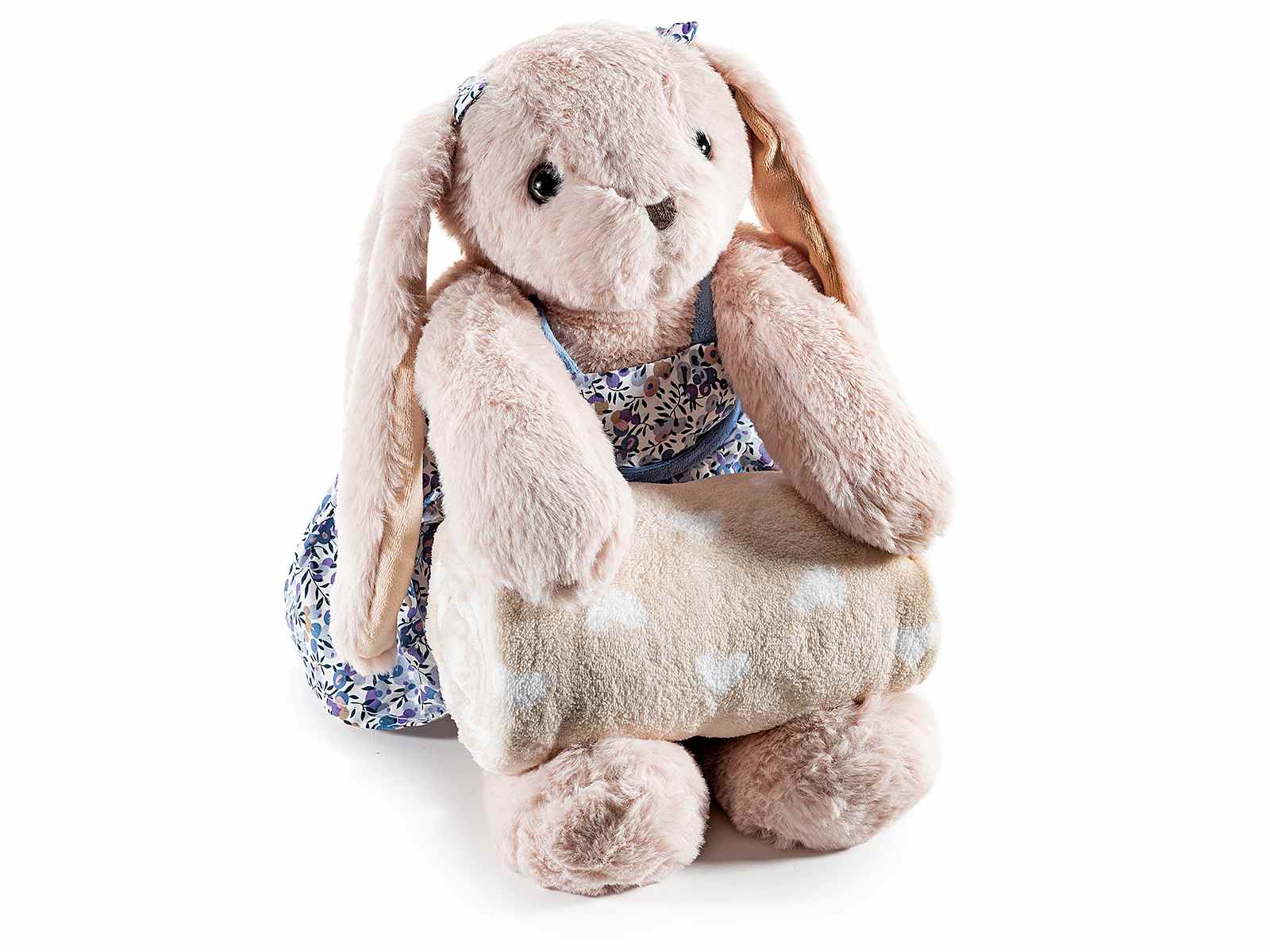 Conigliette in peluche con vestito floreale colorato, orecchie lunghe e morbida copertina in poliestere con cuoricini
