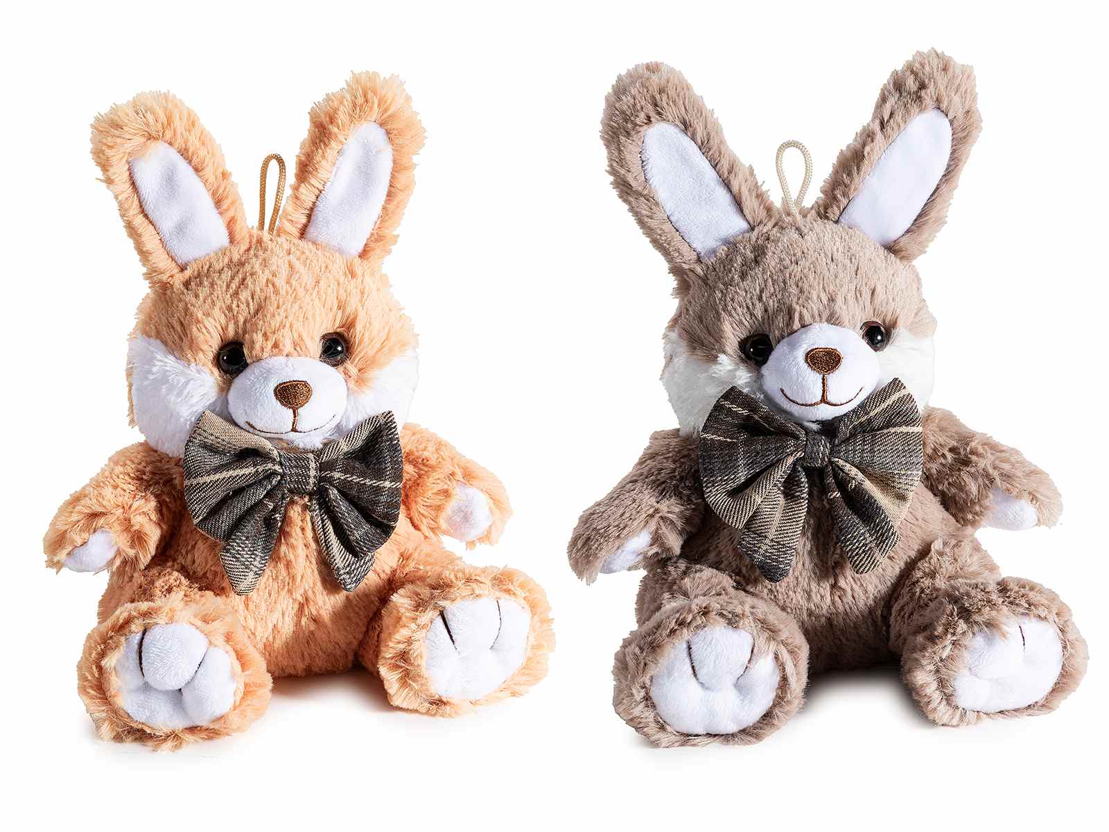 Coniglietti di peluche con fiocco in stoffa a papillon e cordino per appendere