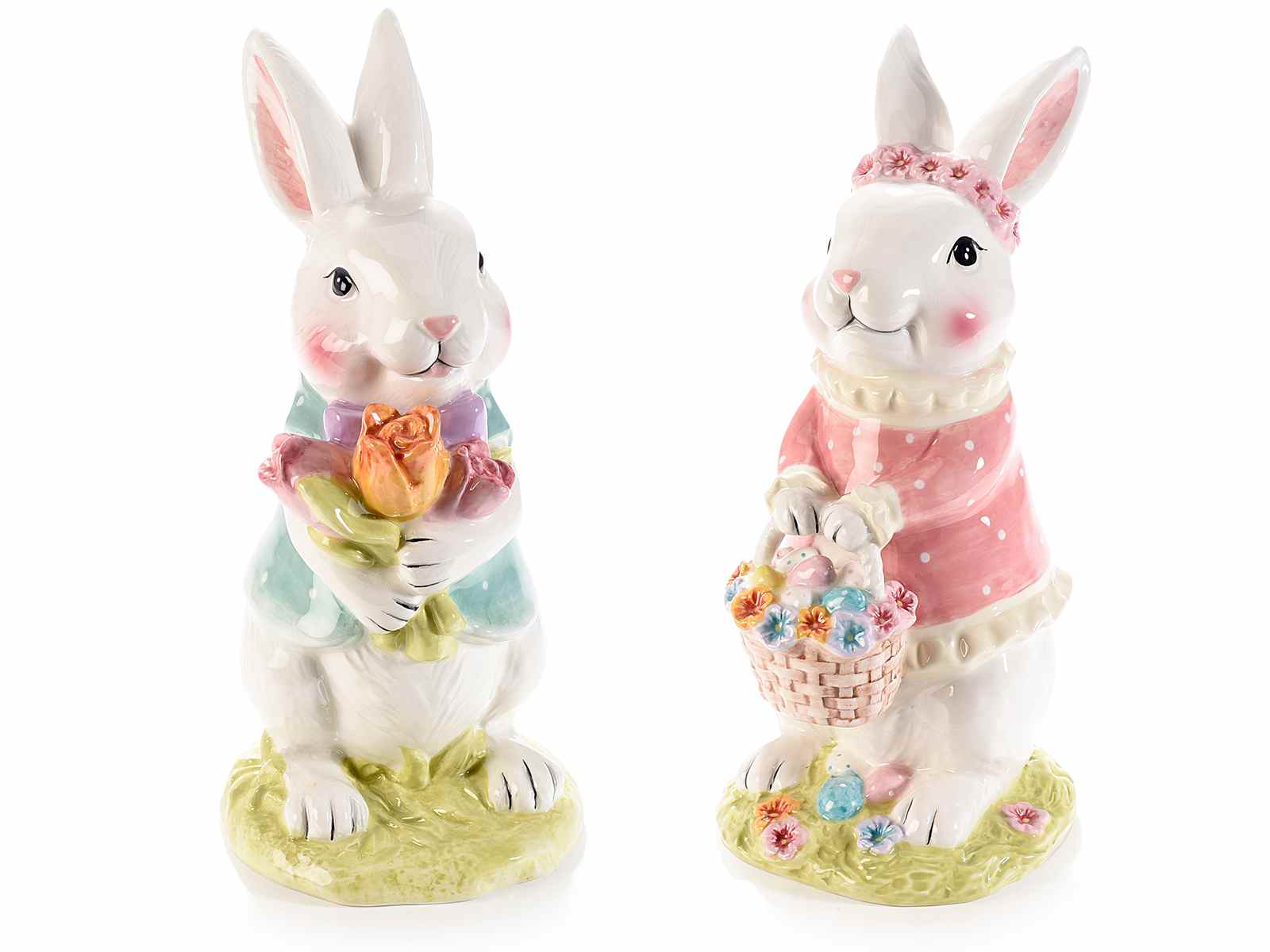 Coppia di coniglietti in ceramica colorata con fiori e uova