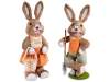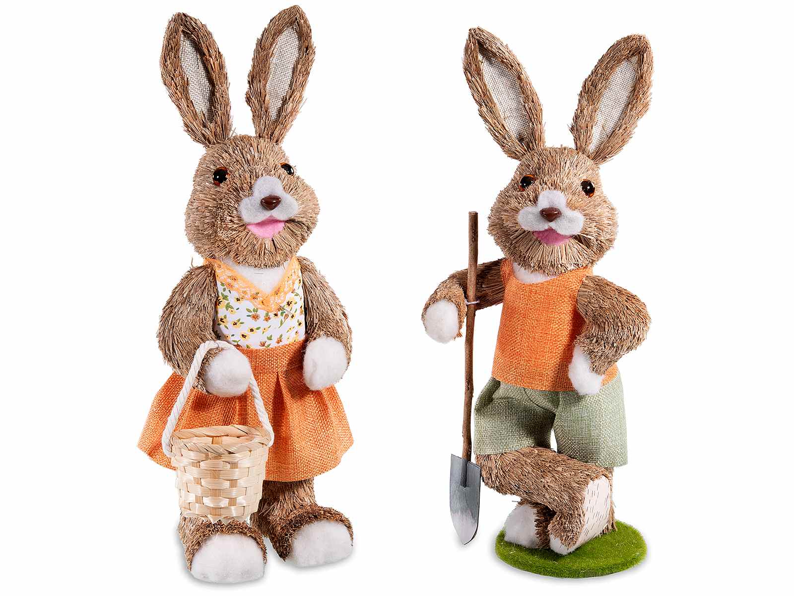 Coppia di coniglietti pasquali in fibra naturale con cestino e pala, ideali per vetrine di Pasqua