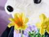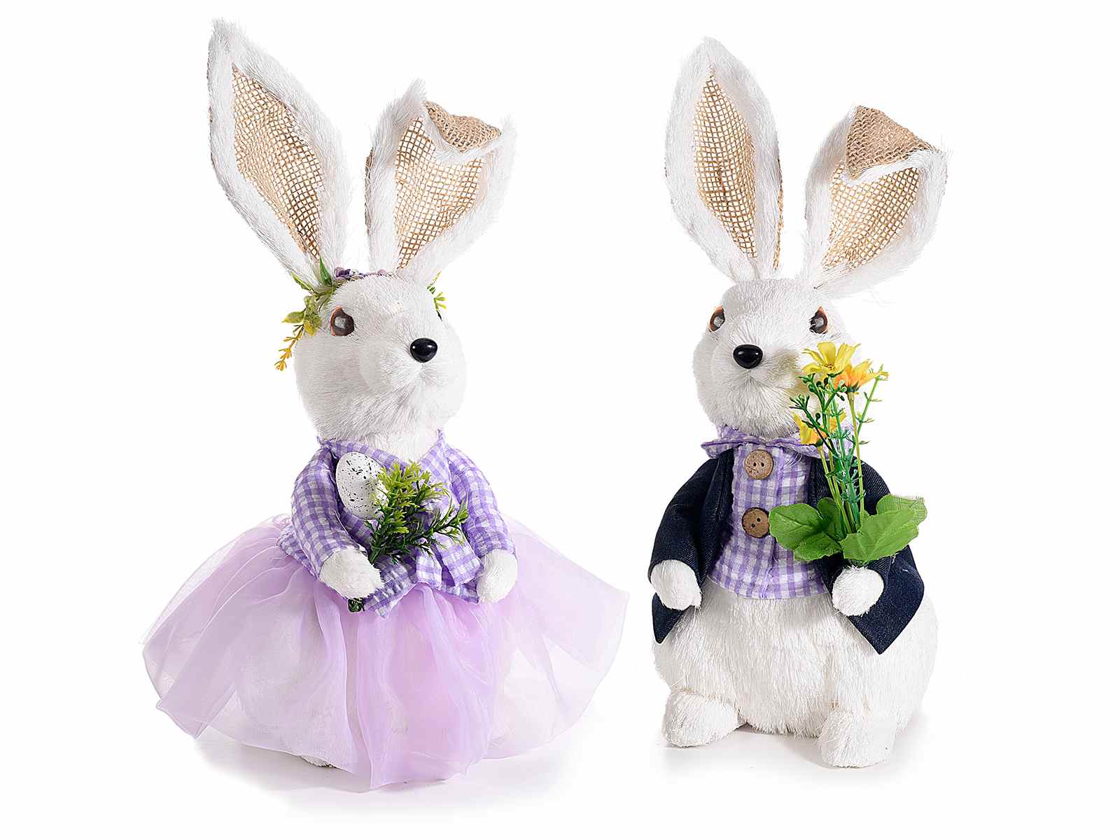 Coppia di coniglietti pasquali in fibra naturale con fiori ed ovetto