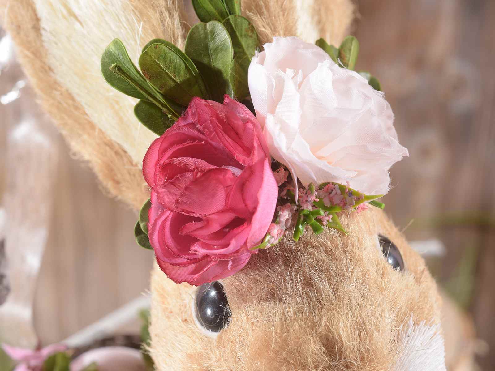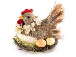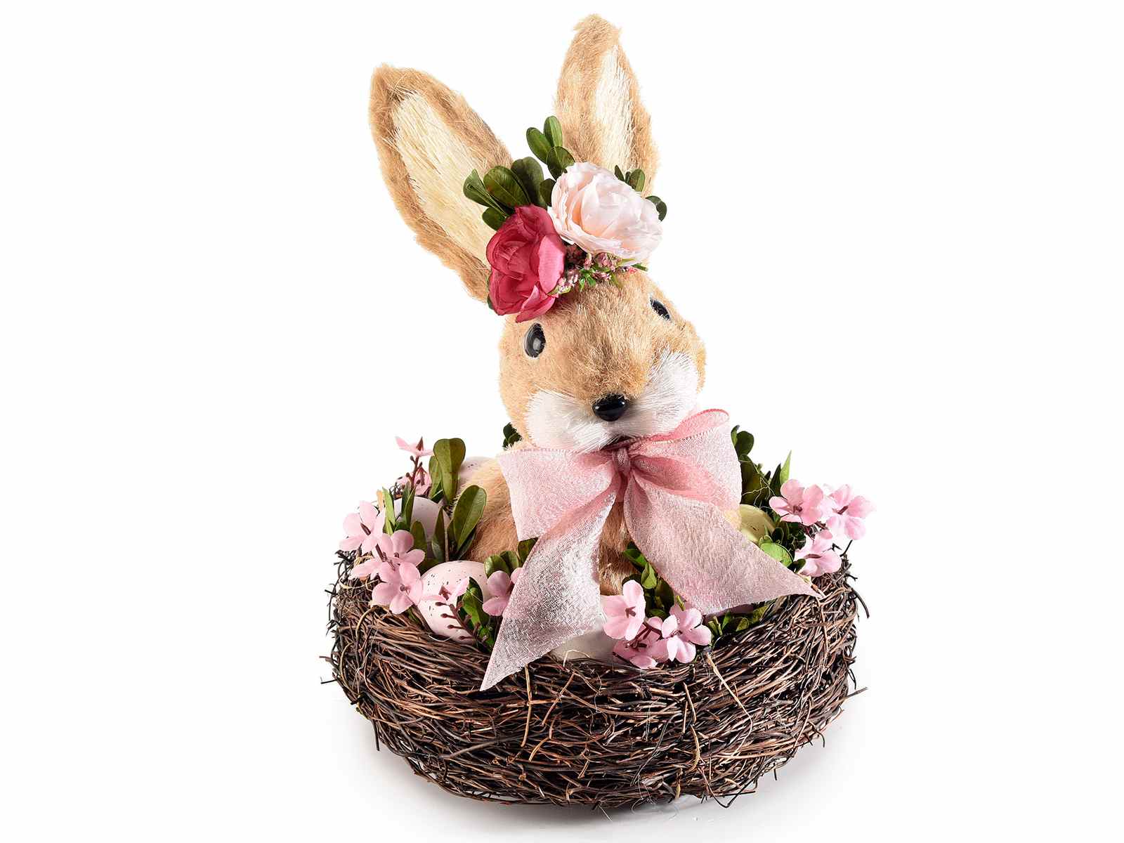 Coniglietto in fibra naturale nel nido con uova e fiorellini