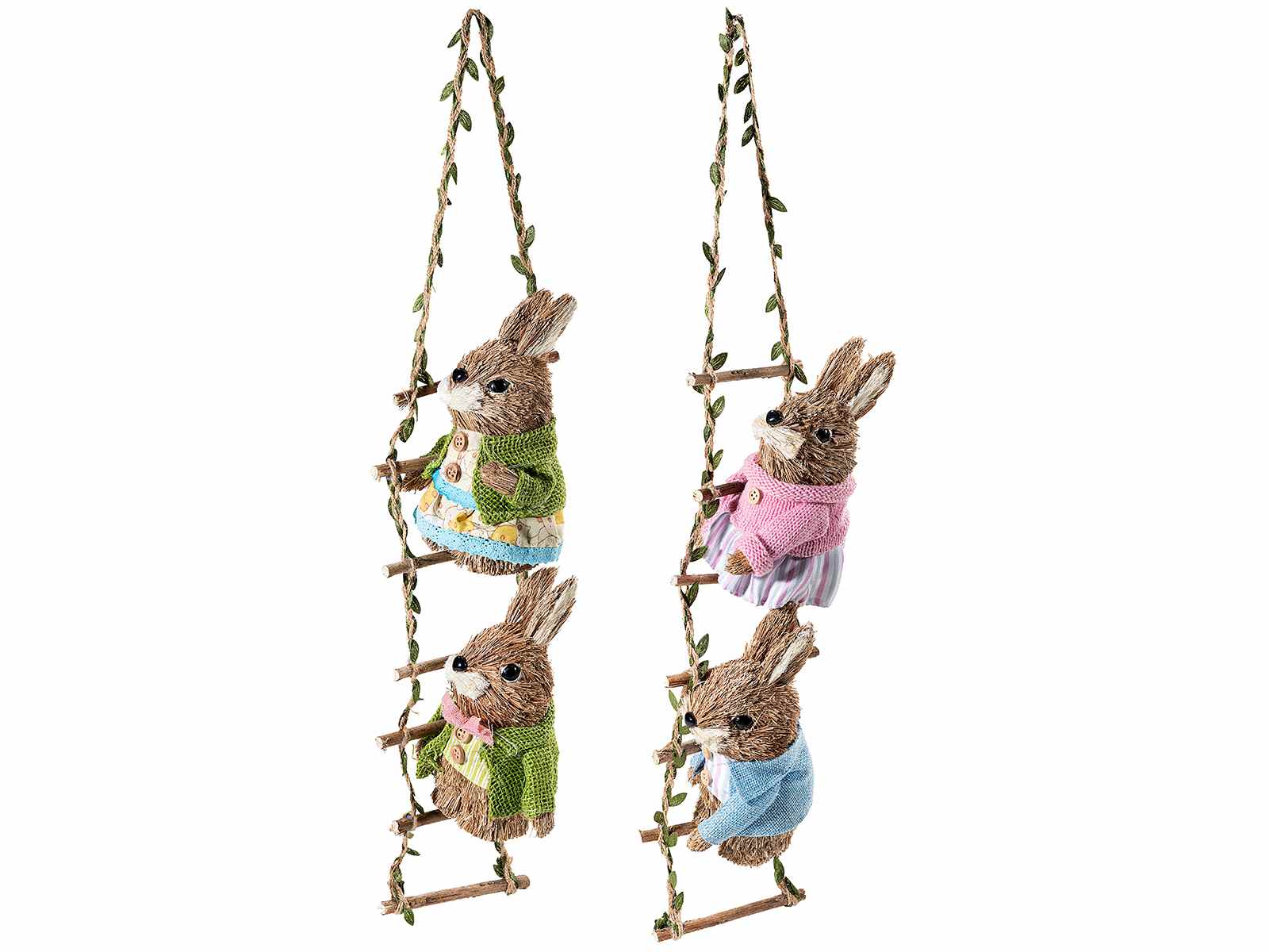 Decorazioni per vetrina di Pasqua con conigli in fibra naturale su scala a pioli da appendere