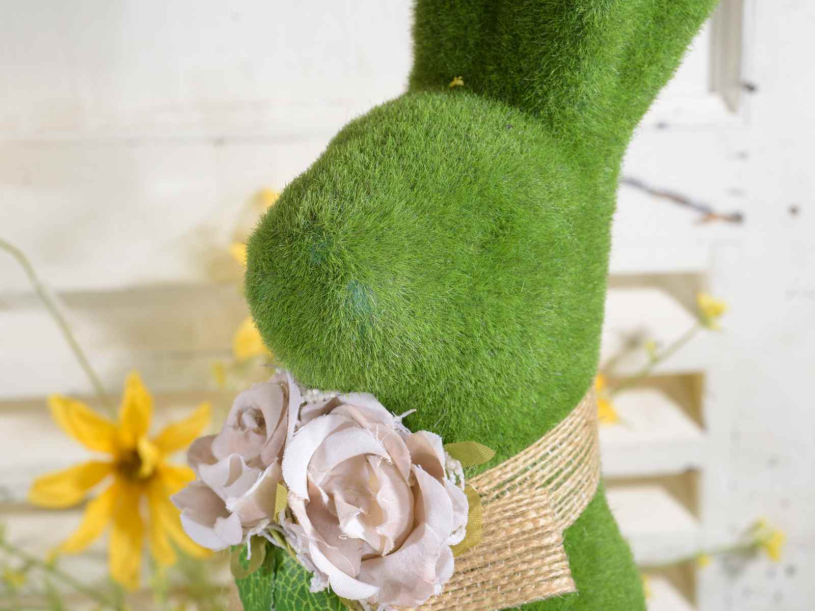 Conigli seduti in resina rivestita di erba artificiale e con fiocchetto