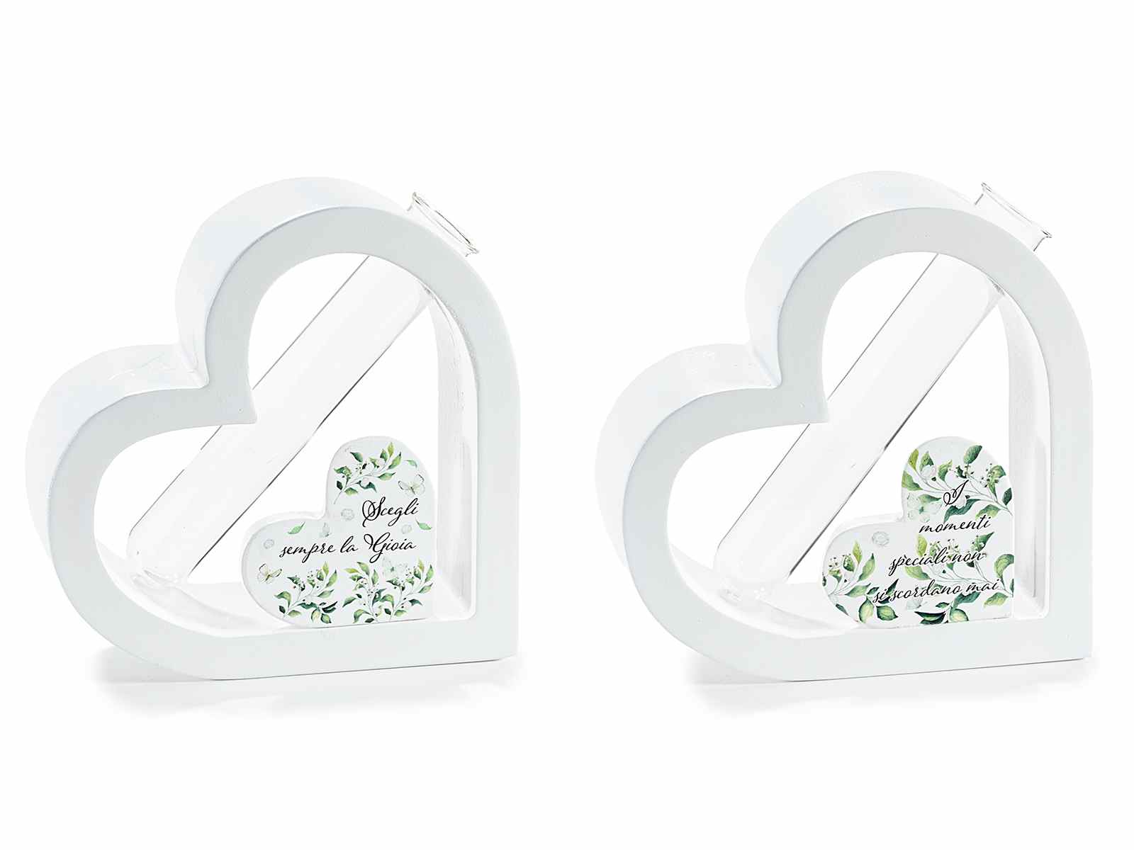 Cuori in legno con decorazione e provetta portaconfetti in vetro