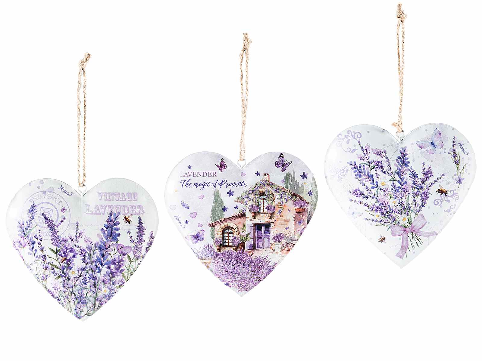 Cuori decorativi in metallo con stampa lavanda e cordino per appendere
