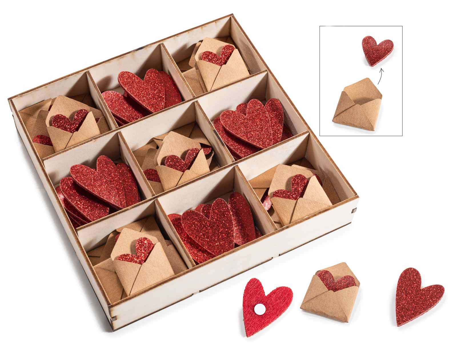 Decorazioni in panno a forma di cuore e letterina in carta con biadesivo. In espositore da 72 pezzi, sono ideali per decorare e confezionare idee regalo San Valentino / innamorati